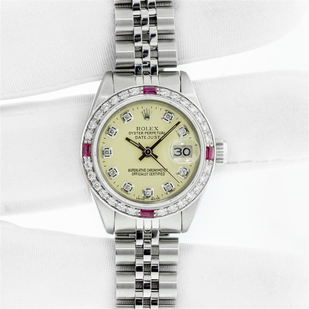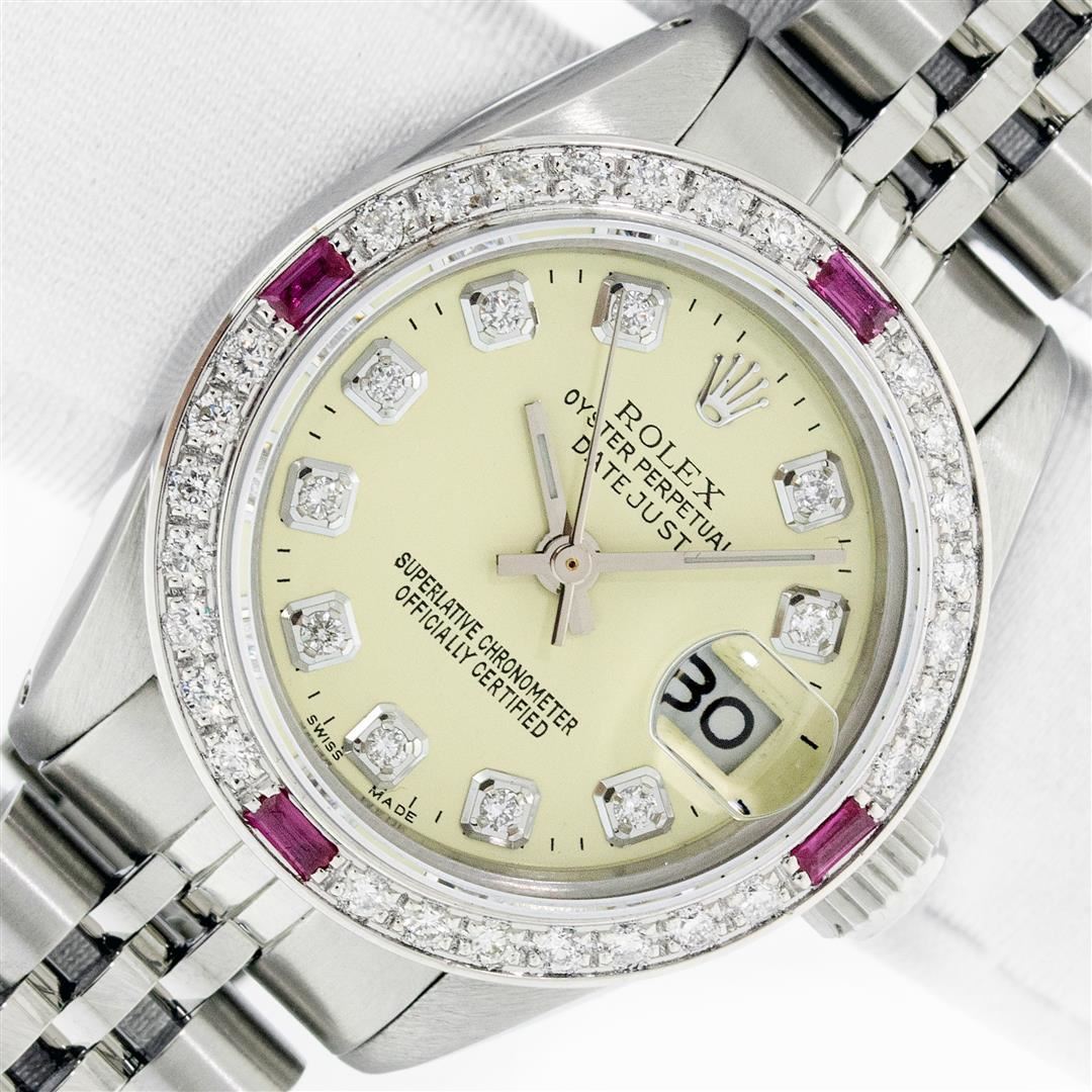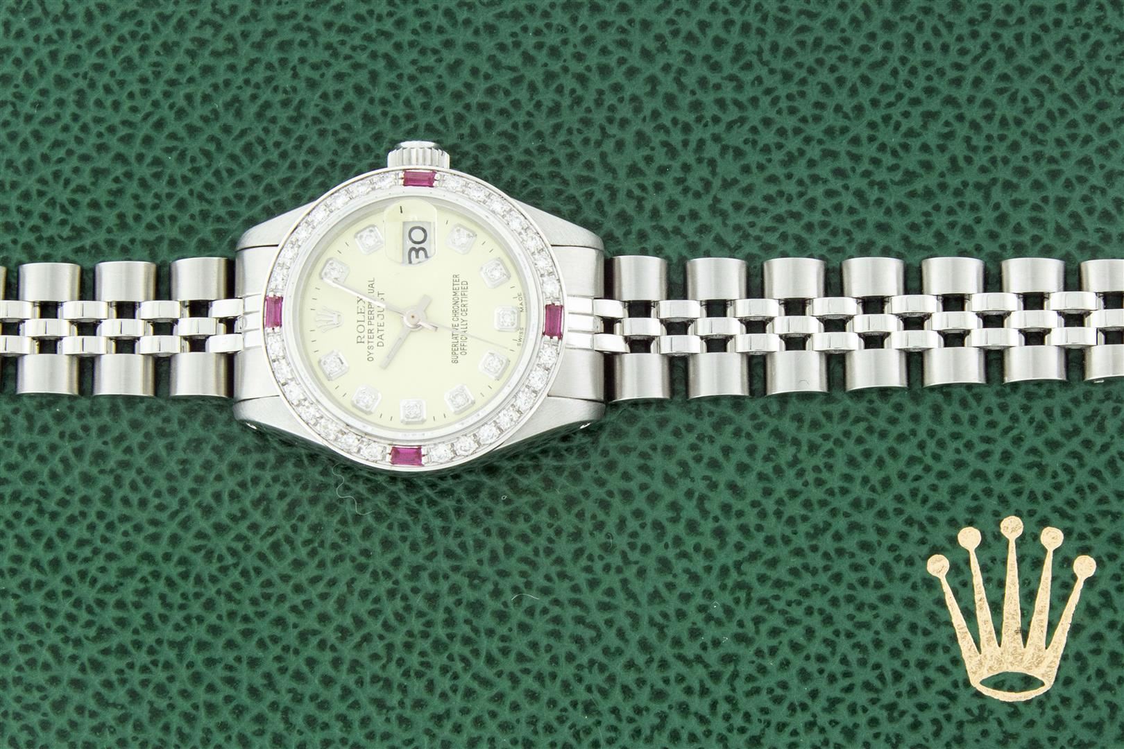 One Ladies Stainless Steel Rolex Datejust Polished Bright with Satin Finish, Serviced & Electronically Tested, Rolex Stainless Steel Case: 26mm, Rolex Stainless Steel Crown, Custom Bezel: New 18K White Gold Ruby Beadset Diamond Bezel, Diamond + Gem Count: 28 Diamonds + 4 Rubies. Total Weight .70 Carat, Clarity: SI-VS, Color: G to H. Custom Crystal: New Sapphire With Magnified Date Window. Custom Hands: New Luminescent Hands. Rolex Movement: Automatic Winding Movement. Custom Dial: Refinished To Yellow With Custom Added Diamonds, 10 Diamonds in Dial, G To H In Color, Clarity: SI-VS. Date Window: 3 O'clock Position Date Display, Model: Datejust. Condition: G-6 Extra Fine. Rolex Bracelet: Stainless Steel Jubilee Band. Bright Polish & Satin Finish. 6.0 Inch Length, Adjustable. Standard Clasp, With Rolex Logo. This Pre Owned Watch Has Been Serviced Time Tested And Is In Excellent Condition It Is Free Of All Scratches And Dents. This Watch Comes With A Rolex Box.