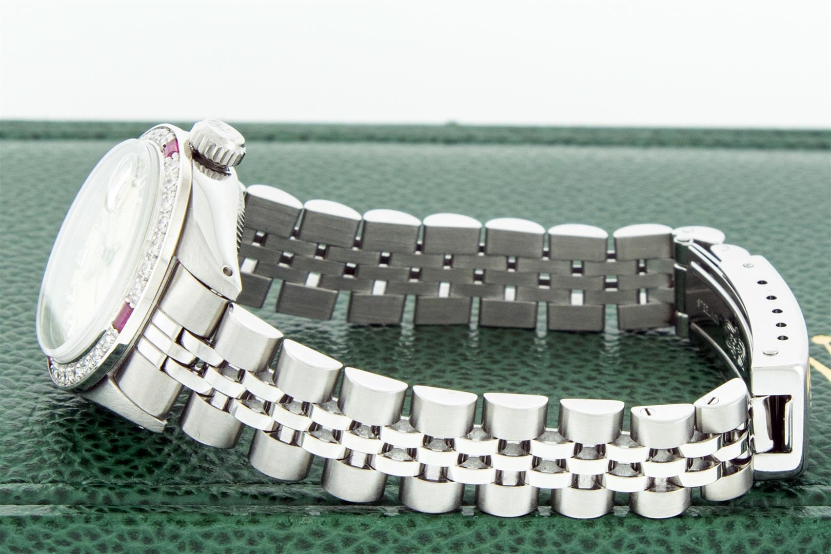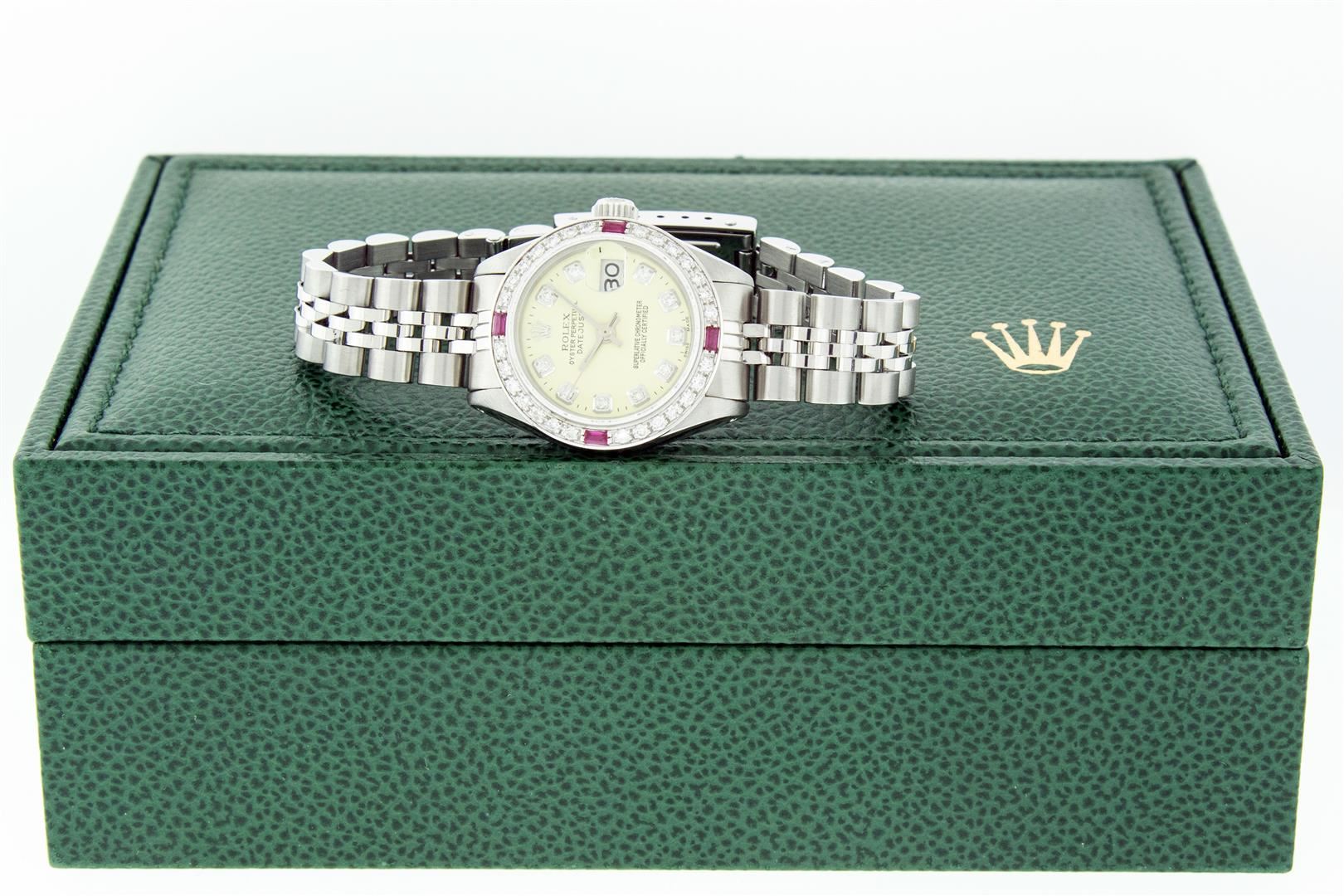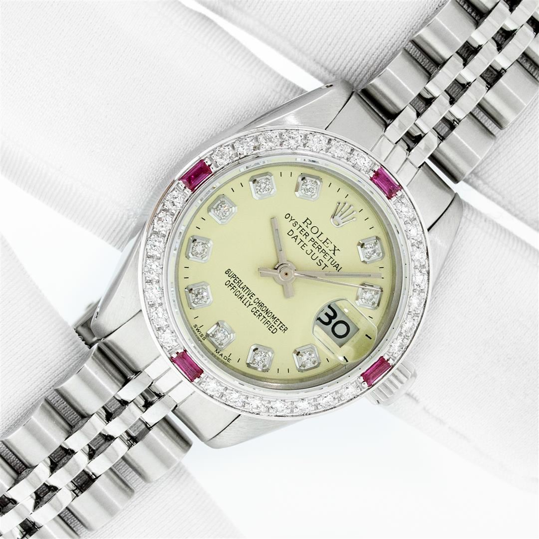 One Ladies Stainless Steel Rolex Datejust Polished Bright with Satin Finish, Serviced & Electronically Tested, Rolex Stainless Steel Case: 26mm, Rolex Stainless Steel Crown, Custom Bezel: New 18K White Gold Ruby Beadset Diamond Bezel, Diamond + Gem Count: 28 Diamonds + 4 Rubies. Total Weight .70 Carat, Clarity: SI-VS, Color: G to H. Custom Crystal: New Sapphire With Magnified Date Window. Custom Hands: New Luminescent Hands. Rolex Movement: Automatic Winding Movement. Custom Dial: Refinished To Yellow With Custom Added Diamonds, 10 Diamonds in Dial, G To H In Color, Clarity: SI-VS. Date Window: 3 O'clock Position Date Display, Model: Datejust. Condition: G-6 Extra Fine. Rolex Bracelet: Stainless Steel Jubilee Band. Bright Polish & Satin Finish. 6.0 Inch Length, Adjustable. Standard Clasp, With Rolex Logo. This Pre Owned Watch Has Been Serviced Time Tested And Is In Excellent Condition It Is Free Of All Scratches And Dents. This Watch Comes With A Rolex Box.