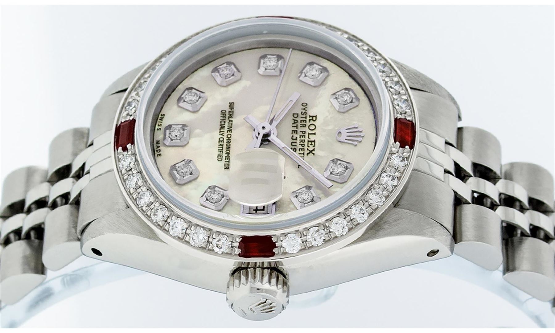 One Ladies Stainless Steel Rolex Datejust Polished Bright with Satin Finish, Serviced & Electronically Tested, Stainless Steel Case: 26mm, Stainless Steel Crown, Custom Bezel: New 18K White Gold Ruby Beadset Diamond Bezel, Diamond + Gem Count: 28 Diamonds + 4 Rubies. Total Weight .70 Carat, Clarity: SI-VS, Color: G to H. Custom Crystal: New Scratch Resistant Synthetic Sapphire Cyclops Lens. Custom Hands: New Luminescent Hands. Movement: Automatic Winding Movement Caliber 2030. Custom Dial: Refinished Yellow Mother Of Pearl With Diamond Hour Markers, 10 Diamonds in Dial, G To H In Color, Clarity: SI-VS. Date Window: 3 O'Clock Position Date Display, Model: Datejust. Condition: G-6 Extra Fine. Bracelet: Stainless Steel Jubilee Band. Bright Polish & Satin Finish. 6.0 Inch Length, Adjustable. Standard Clasp, With Rolex Logo. This Watch Has Been Serviced Time Tested And Is In Excellent Condition It Is Free Of All Scratches And Dents.