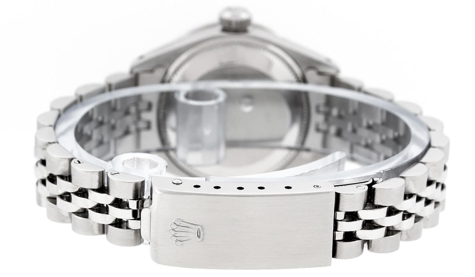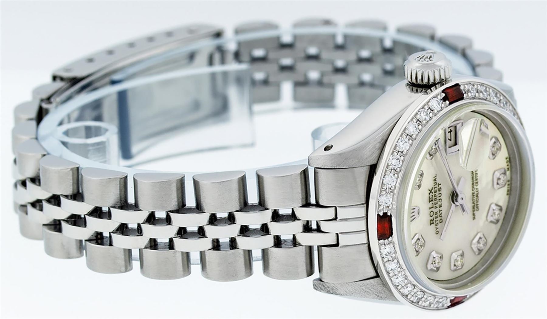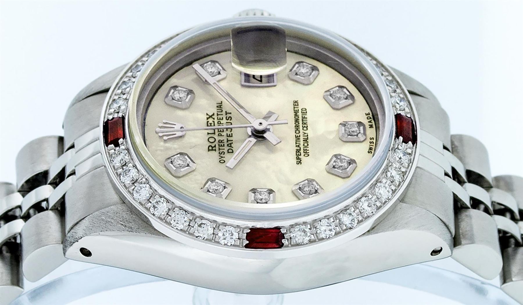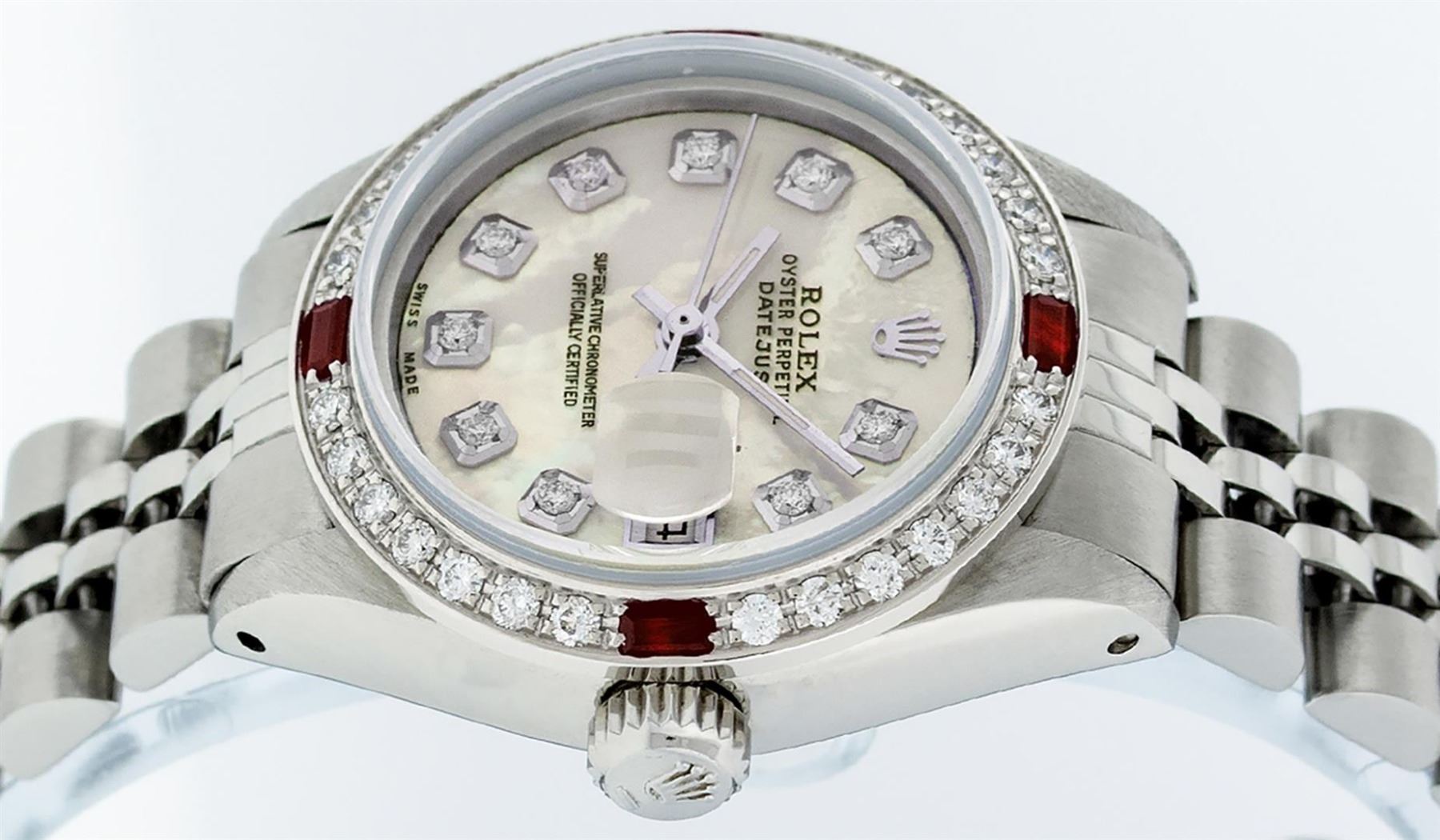 One Ladies Stainless Steel Rolex Datejust Polished Bright with Satin Finish, Serviced & Electronically Tested, Stainless Steel Case: 26mm, Stainless Steel Crown, Custom Bezel: New 18K White Gold Ruby Beadset Diamond Bezel, Diamond + Gem Count: 28 Diamonds + 4 Rubies. Total Weight .70 Carat, Clarity: SI-VS, Color: G to H. Custom Crystal: New Scratch Resistant Synthetic Sapphire Cyclops Lens. Custom Hands: New Luminescent Hands. Movement: Automatic Winding Movement Caliber 2030. Custom Dial: Refinished Yellow Mother Of Pearl With Diamond Hour Markers, 10 Diamonds in Dial, G To H In Color, Clarity: SI-VS. Date Window: 3 O'Clock Position Date Display, Model: Datejust. Condition: G-6 Extra Fine. Bracelet: Stainless Steel Jubilee Band. Bright Polish & Satin Finish. 6.0 Inch Length, Adjustable. Standard Clasp, With Rolex Logo. This Watch Has Been Serviced Time Tested And Is In Excellent Condition It Is Free Of All Scratches And Dents.