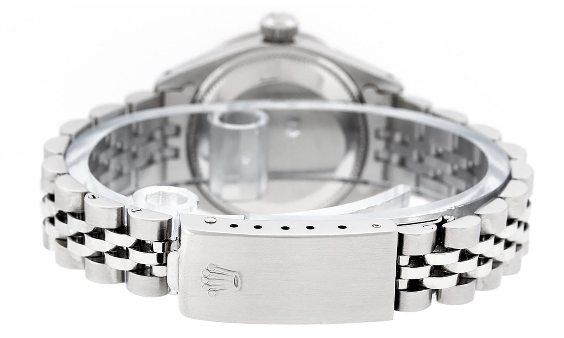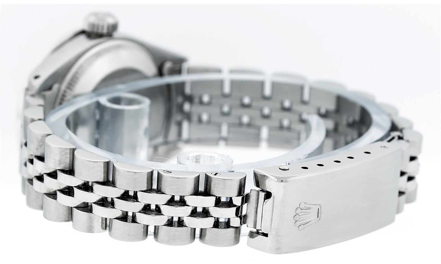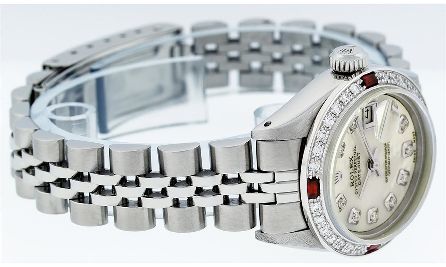One Ladies Pre Owned Stainless Steel Rolex Datejust Polished Bright with Satin Finish, Serviced & Electronically Tested, Stainless Steel Case: 26mm, Stainless Steel Crown, Custom Bezel: New 18K White Gold Ruby Beadset Diamond Bezel, Diamond + Gem Count: 28 Diamonds + 4 Rubies. Clarity: SI-VS, Color: G to H. Custom Crystal: New Sapphire With Date Window. Custom Hands: New Luminescent Hands. Rolex Movement: Automatic Winding Movement. Custom Dial: Yellow Mother Of Pearl With Custom Added Diamond Hour Markers, 10 Diamonds in Dial, G To H In Color, Clarity: SI-VS. Date Window: 3 O'Clock Position Date Display, Model: Datejust. Condition: G-6 Extra Fine. Rolex Bracelet: Stainless Steel Jubilee Band. Bright Polish & Satin Finish. 6.0 Inch Length, Adjustable. Standard Clasp, With Rolex Logo. This Watch Has Been Serviced Time Tested And Is In Excellent Condition It Is Free Of All Scratches And Dents.