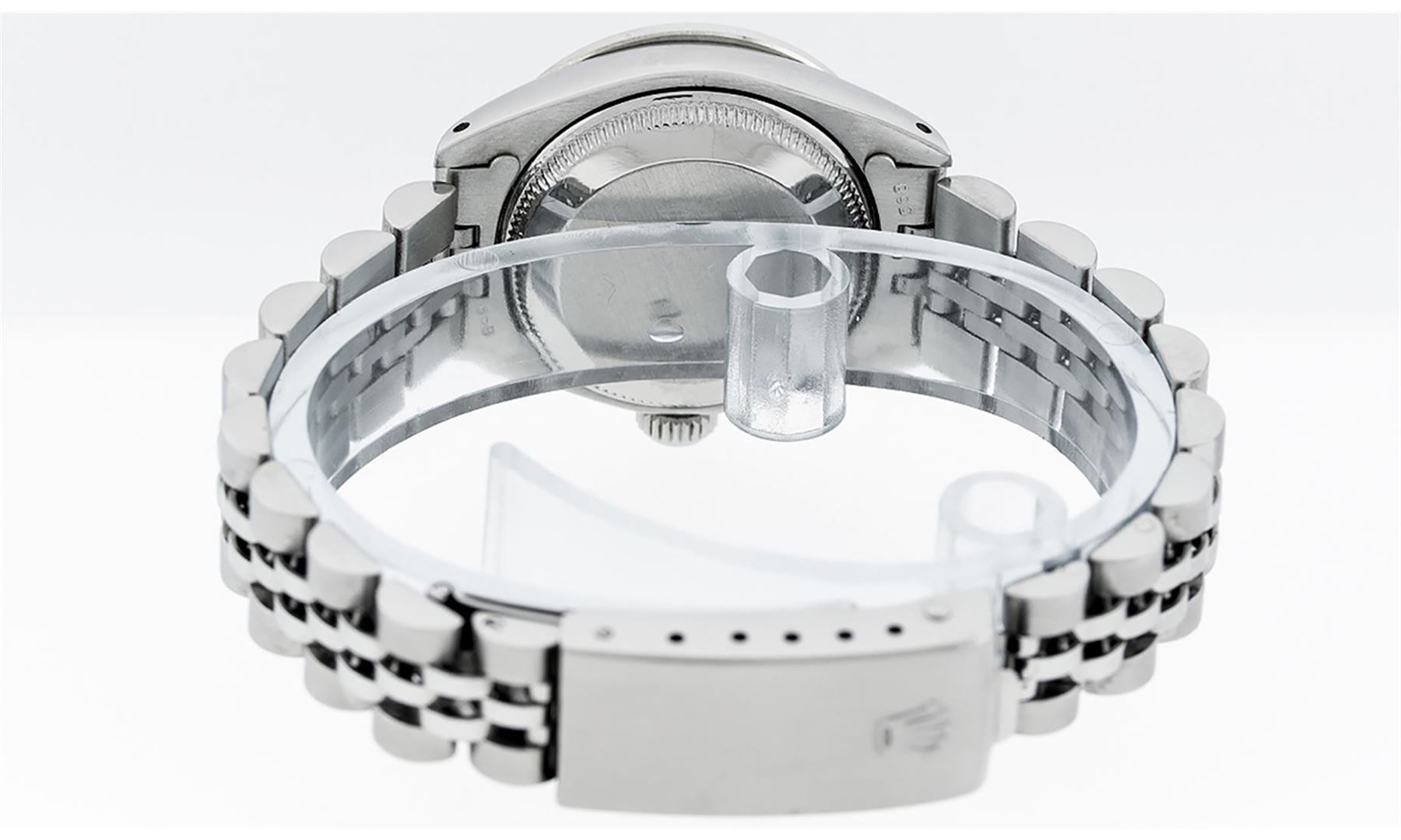 One Ladies Pre Owned Stainless Steel Rolex Datejust Polished Bright with Satin Finish, Serviced & Electronically Tested, Stainless Steel Case: 26mm, Stainless Steel Crown, Custom Bezel: New 18K White Gold Ruby Beadset Diamond Bezel, Diamond + Gem Count: 28 Diamonds + 4 Rubies. Clarity: SI-VS, Color: G to H. Custom Crystal: New Sapphire With Date Window. Custom Hands: New Luminescent Hands. Rolex Movement: Automatic Winding Movement. Custom Dial: Yellow Mother Of Pearl With Custom Added Diamond Hour Markers, 10 Diamonds in Dial, G To H In Color, Clarity: SI-VS. Date Window: 3 O'Clock Position Date Display, Model: Datejust. Condition: G-6 Extra Fine. Rolex Bracelet: Stainless Steel Jubilee Band. Bright Polish & Satin Finish. 6.0 Inch Length, Adjustable. Standard Clasp, With Rolex Logo. This Watch Has Been Serviced Time Tested And Is In Excellent Condition It Is Free Of All Scratches And Dents.