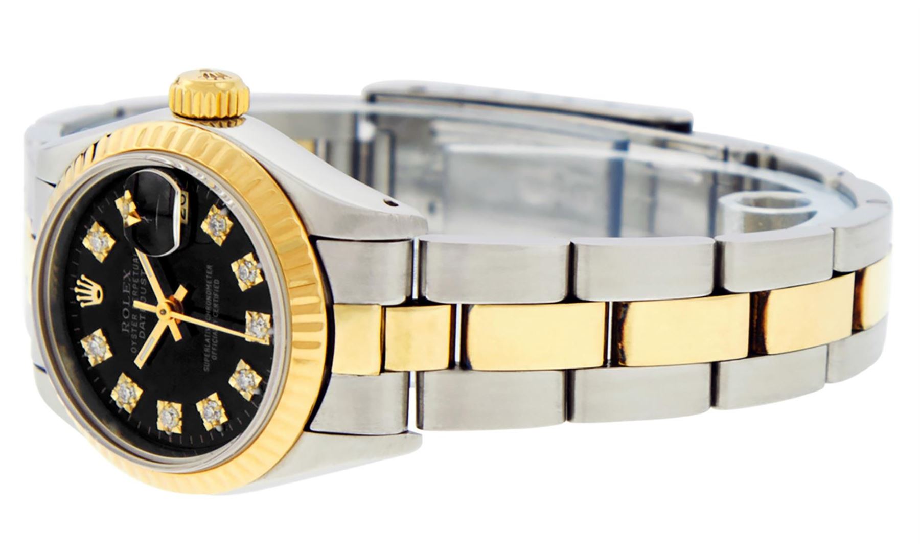 One Ladies 14K Two Tone Rolex Datejust Polished, Serviced & Electronically Tested, 14K Yellow Gold & Stainless Steel Case: 26mm, 14K Yellow Gold Crown, Bezel: 14K Yellow Gold Fluted Bezel. Custom Crystal: New Acrylic Cyclops Lens. Custom Hands: New Luminescent Hands. Movement: Automatic Winding Movement Caliber 2030. Custom Dial: Black With Diamond Hour Markers, Diamond Count: 10 Single Cut Diamonds, Color: G to H, Clarity: VS. Date Window: 3 O'clock Position Date Display, Model: Datejust. Condition: G-6 Extra Fine. Bracelet: Two Tone 14K Yellow Gold & Stainless Steel Oyster Band. Bright Polish. 6.0 Inch Length, Adjustable. Standard Clasp, With Rolex Logo. This Watch Has Been Serviced Time Tested And Is In Excellent Condition It Is Free Of All Scratches And Dents.