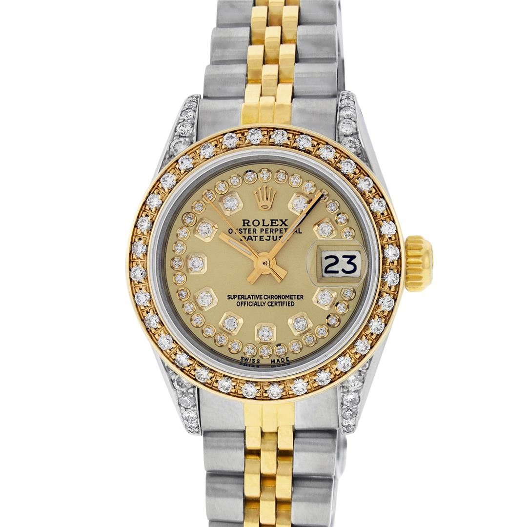 One Ladies 14K Two Tone Rolex Datejust Polished, Serviced & Electronically Tested, 14K Yellow Gold & Stainless Steel Case: 26mm, 14K Yellow Gold Crown, Diamond Lugs: 24 Diamonds On Lugs, Clarity: SI-VS, Color: G to H, Clarity SI-VS. Custom Bezel: New 18K Yellow Gold Beadset Diamond Bezel, Diamond Count: 32 Diamonds, Total Weight .70 Carat, Clarity: SI-VS, Color: G to H. Custom Crystal: New Synthetic Sapphire Cyclops Lens. Custom Hands: New Luminescent Hands. Movement: Automatic Winding Movement Caliber 2030. Custom Dial: Champagne With Diamond Hour Markers, Diamond Count: 43 Diamonds In Dial, Clarity: SI-VS, Color: G to H. Date Window: 3 O'Clock Position Date Display, Model: Datejust. Condition: G-6 Extra Fine. Bracelet: Two Tone 14K Yellow Gold & Stainless Steel Jubilee. Bright Polish. 6.0 Inch Length, Adjustable. Standard Clasp, With Rolex Logo. This Watch Has Been Serviced Time Tested And Is In Excellent Condition It Is Free Of All Scratches And Dents.