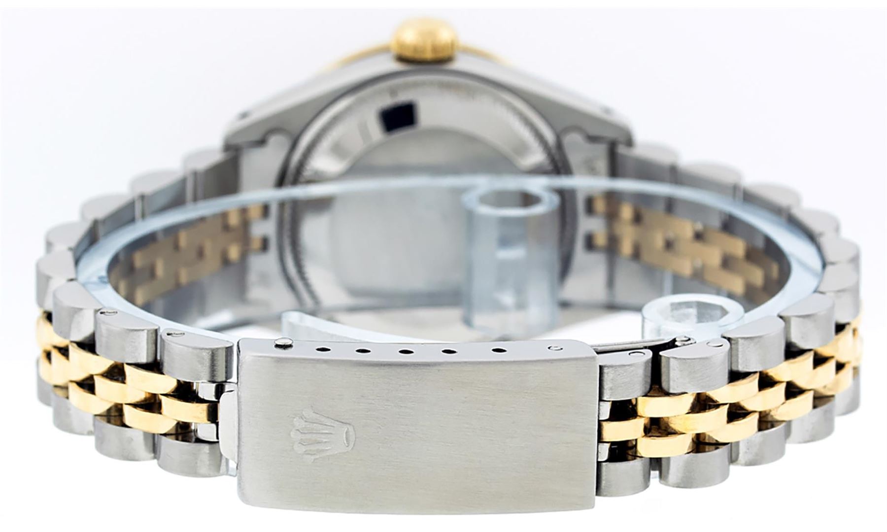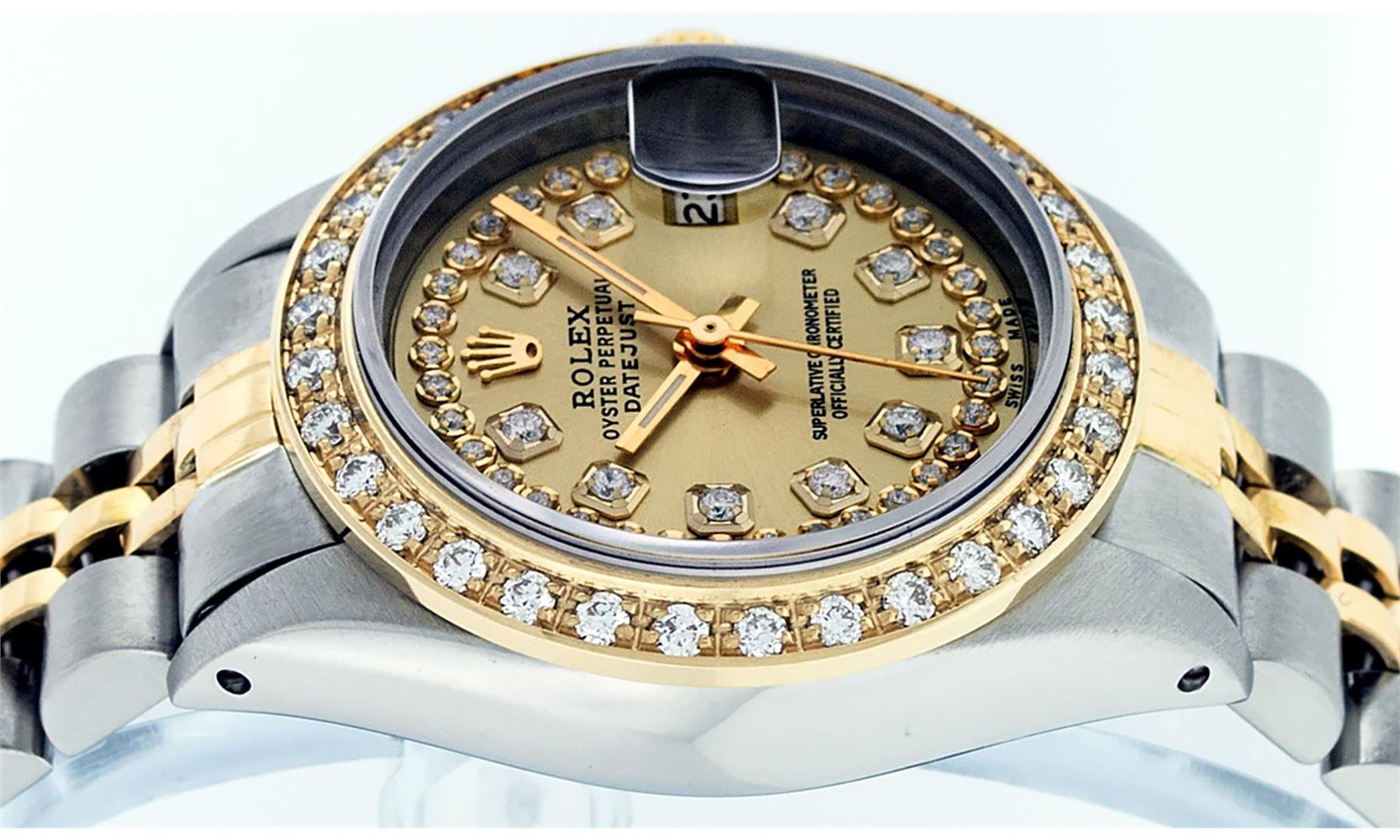 One Ladies 14K Two Tone Rolex Datejust Polished, Serviced & Electronically Tested, 14K Yellow Gold & Stainless Steel Case: 26mm, 14K Yellow Gold Crown, Custom Bezel: New 18K Yellow Gold Beadset Diamond Bezel, Diamond Count: 32 Diamonds Total Weight .70 Carat, Clarity: SI-VS, Color: G to H. Custom Crystal: New Synthetic Sapphire Cyclops Lens. Custom Hands: New Luminescent Hands. Movement: Automatic Winding Movement Caliber 2030. Custom Dial: Champagne String Diamond Dial, Diamond Count: 43 Diamonds, Clarity: SI-VS, Color: G to H. Date Window: 3 O'clock Position Date Display, Model: Datejust. Condition: G-6 Extra Fine. Bracelet: Two Tone 14K Yellow Gold & Stainless Steel Jubilee. Bright Polish. 6.0 Inch Length, Adjustable. Standard Clasp, With Rolex Logo. This Watch Has Been Serviced Time Tested And Is In Excellent Condition It Is Free Of All Scratches And Dents.