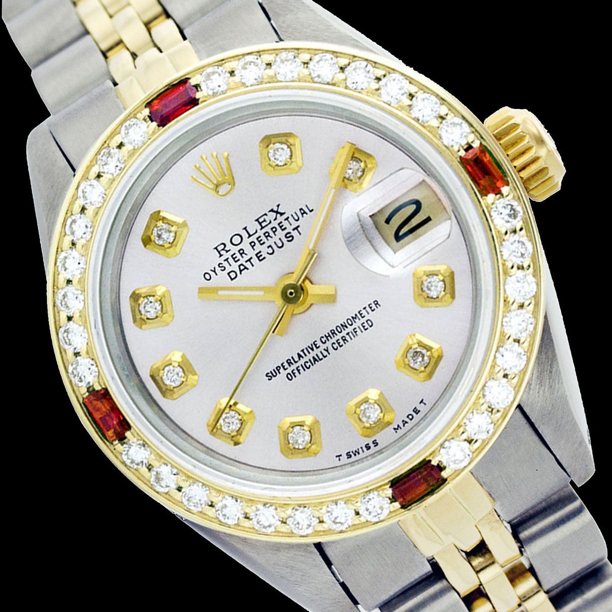 WATCH DETAILS: ITEM: WatchBRAND: RolexTYPE: Two ToneFEATURE: MODEL: DateJustMADE: Swiss MadeGENDER: LadiesCONDITION: Pre-OwnedFUNCTION: DateDIAL COLOR: WhiteHOUR MARKERS: 10 Round Custom Made DiamondBEZEL TYPE: Custom Made Diamond & Ruby BezelBEZEL STONE: Diamond G-VVS1 & 4 Burmise RubyBEZEL MATERIAL: 18K GoldBRACELET TYPE: Jubilee BRACELET MATERIAL: 14K Yellow Gold & Stainless SteelCLASP TYPE: Folding ClaspCLASP MATERIAL: Stainless SteelCASE STONE: CASE SIZE: 26mmCRYSTAL: Scratch Resistance Sapphire CrystalMOVEMENT: Automatic (Self Winding)CALIBER: 2030CROWN TYPE: Screw Down CrownWATER RESISTANCE: Waterproof to 10 ATM/100 meters/330 feetMODEL #: 6917SKU #: ALTJNS74We Buy/Sell/Trade Valuable watches, Please call us