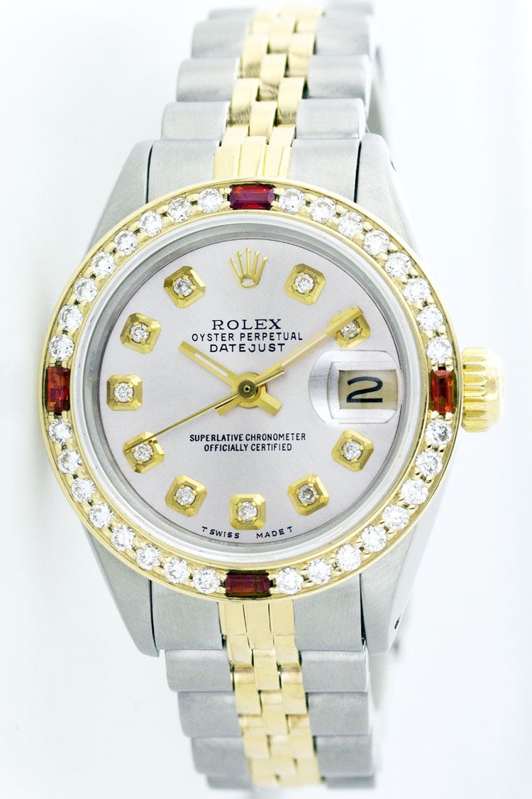 WATCH DETAILS: ITEM: WatchBRAND: RolexTYPE: Two ToneFEATURE: MODEL: DateJustMADE: Swiss MadeGENDER: LadiesCONDITION: Pre-OwnedFUNCTION: DateDIAL COLOR: WhiteHOUR MARKERS: 10 Round Custom Made DiamondBEZEL TYPE: Custom Made Diamond & Ruby BezelBEZEL STONE: Diamond G-VVS1 & 4 Burmise RubyBEZEL MATERIAL: 18K GoldBRACELET TYPE: Jubilee BRACELET MATERIAL: 14K Yellow Gold & Stainless SteelCLASP TYPE: Folding ClaspCLASP MATERIAL: Stainless SteelCASE STONE: CASE SIZE: 26mmCRYSTAL: Scratch Resistance Sapphire CrystalMOVEMENT: Automatic (Self Winding)CALIBER: 2030CROWN TYPE: Screw Down CrownWATER RESISTANCE: Waterproof to 10 ATM/100 meters/330 feetMODEL #: 6917SKU #: ALTJNS74We Buy/Sell/Trade Valuable watches, Please call us