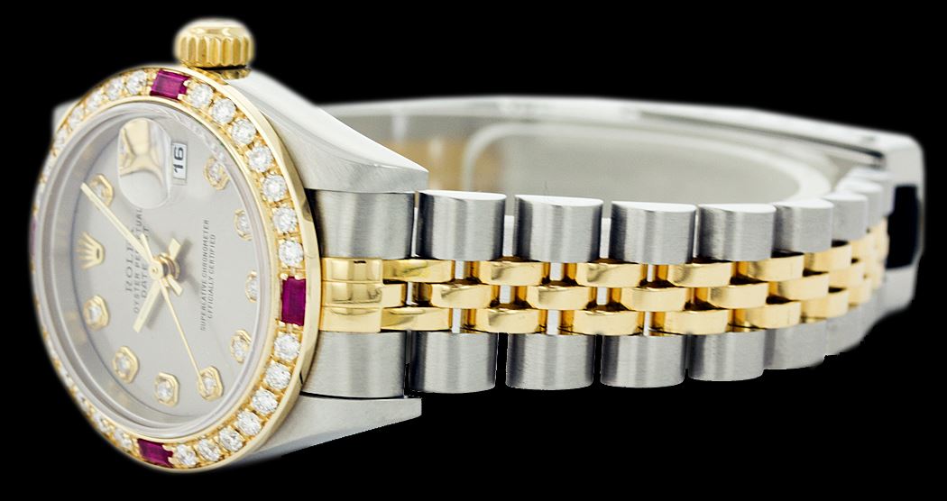 WATCH DETAILS: ITEM: WatchBRAND: RolexTYPE: Two ToneFEATURE: MODEL: DateJustMADE: Swiss MadeGENDER: LadiesCONDITION: Pre-OwnedFUNCTION: DateDIAL COLOR: SilverHOUR MARKERS: 10 Round Custom Made DiamondBEZEL TYPE: Custom Made Diamond & Ruby BezelBEZEL STONE: Diamond G-VVS1 & 4 Burmise RubyBEZEL MATERIAL: 18K GoldBRACELET TYPE: Jubilee BRACELET MATERIAL: 14K Yellow Gold & Stainless SteelCLASP TYPE: Folding ClaspCLASP MATERIAL: Stainless SteelCASE STONE: CASE SIZE: 26mmCRYSTAL: Scratch Resistance Sapphire CrystalMOVEMENT: Automatic (Self Winding)CALIBER: 2030CROWN TYPE: Screw Down CrownWATER RESISTANCE: Waterproof to 10 ATM/100 meters/330 feetMODEL #: 6917SKU #: ALTJNS58We Buy/Sell/Trade Valuable watches, Please call us