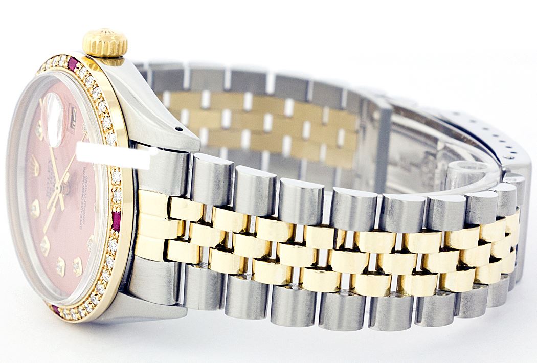 WATCH DETAILS: ITEM: WatchBRAND: RolexTYPE: Two ToneFEATURE: MODEL: DateJustMADE: Swiss MadeGENDER: LadiesCONDITION: Pre-OwnedFUNCTION: DateDIAL COLOR: PeachHOUR MARKERS: 10 Round Custom Made DiamondBEZEL TYPE: Custom Made Diamond & Ruby BezelBEZEL STONE: Diamond G-VVS1 & 4 Burmise RubyBEZEL MATERIAL: 18K GoldBRACELET TYPE: Jubilee BRACELET MATERIAL: 14K Yellow Gold & Stainless SteelCLASP TYPE: Folding ClaspCLASP MATERIAL: Stainless SteelCASE STONE: CASE SIZE: 26mmCRYSTAL: Scratch Resistance Sapphire CrystalMOVEMENT: Automatic (Self Winding)CALIBER: 2030CROWN TYPE: Screw Down CrownWATER RESISTANCE: Waterproof to 10 ATM/100 meters/330 feetMODEL #: 6917SKU #: ALTJNS110We Buy/Sell/Trade Valuable watches, Please call us