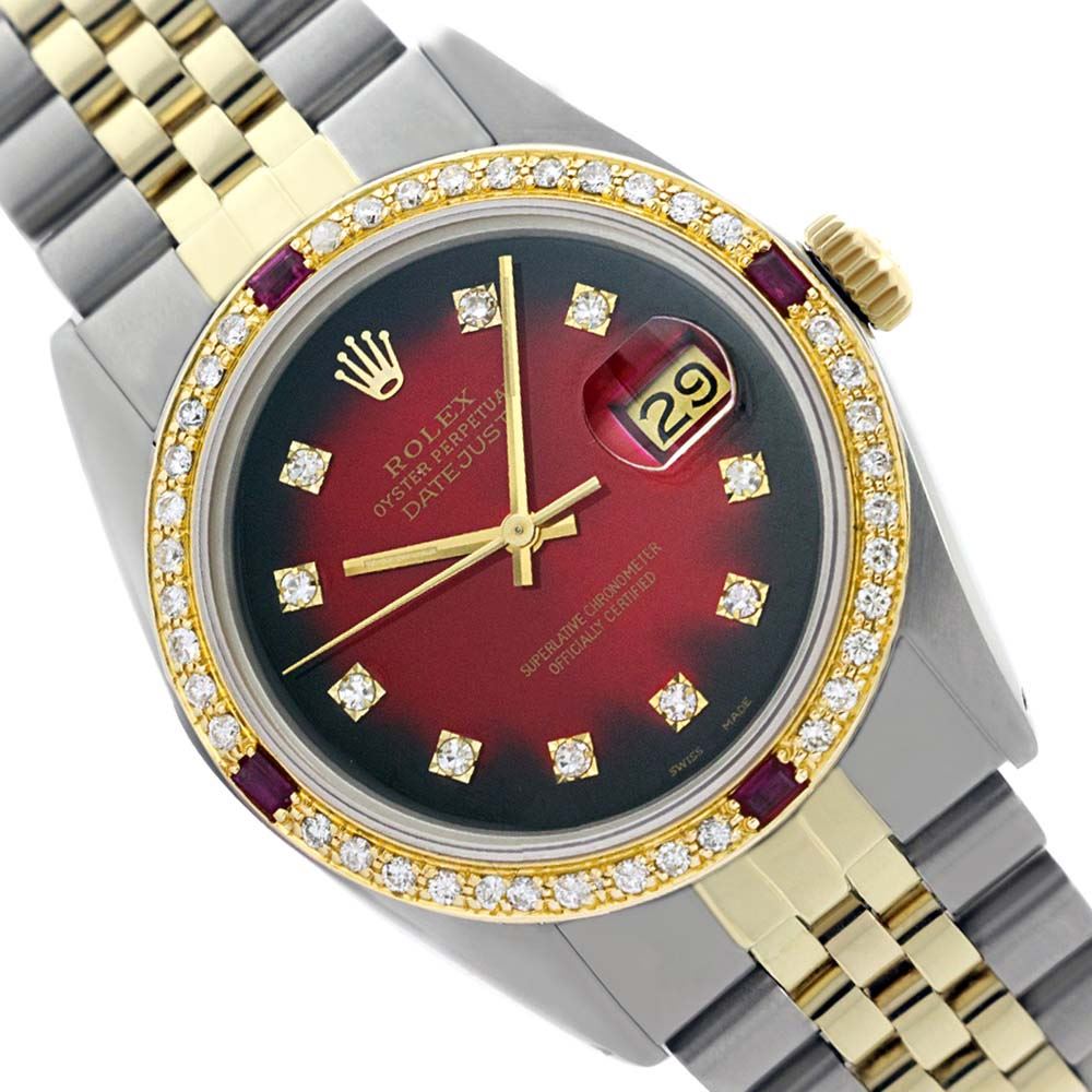 WATCH DETAILS: ITEM: WatchBRAND: RolexTYPE: Two ToneFEATURE: MODEL: DateJustMADE: Swiss MadeGENDER: LadiesCONDITION: Pre-OwnedFUNCTION: DateDIAL COLOR: Red Vignette HOUR MARKERS: 10 Round Custom Made DiamondBEZEL TYPE: Custom Made Diamond & Ruby BezelBEZEL STONE: Diamond G-VVS1 & 4 Burmise RubyBEZEL MATERIAL: 18K GoldBRACELET TYPE: Jubilee BRACELET MATERIAL: 14K Yellow Gold & Stainless SteelCLASP TYPE: Folding ClaspCLASP MATERIAL: Stainless SteelCASE STONE: CASE SIZE: 26mmCRYSTAL: Scratch Resistance Sapphire CrystalMOVEMENT: Automatic (Self Winding)CALIBER: 2030CROWN TYPE: Screw Down CrownWATER RESISTANCE: Waterproof to 10 ATM/100 meters/330 feetMODEL #: 6917SKU #: ALTJNS16We Buy/Sell/Trade Valuable watches, Please call us