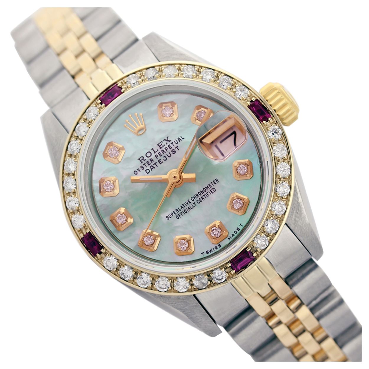WATCH DETAILS: ITEM: WatchBRAND: RolexTYPE: Two ToneFEATURE: MODEL: DateJustMADE: Swiss MadeGENDER: LadiesCONDITION: Pre-OwnedFUNCTION: DateDIAL COLOR: Blue Mother Of PearlHOUR MARKERS: 10 Round Custom Made DiamondBEZEL TYPE: Custom Made Diamond & Ruby BezelBEZEL STONE: Diamond G-VVS1 & 4 Burmise RubyBEZEL MATERIAL: 18K GoldBRACELET TYPE: Jubilee BRACELET MATERIAL: 14K Yellow Gold & Stainless SteelCLASP TYPE: Folding ClaspCLASP MATERIAL: Stainless SteelCASE STONE: CASE SIZE: 26mmCRYSTAL: Scratch Resistance Sapphire CrystalMOVEMENT: Automatic (Self Winding)CALIBER: 2030CROWN TYPE: Screw Down CrownWATER RESISTANCE: Waterproof to 10 ATM/100 meters/330 feetMODEL #: 6917SKU #: ALTJNS54We Buy/Sell/Trade Valuable watches, Please call us