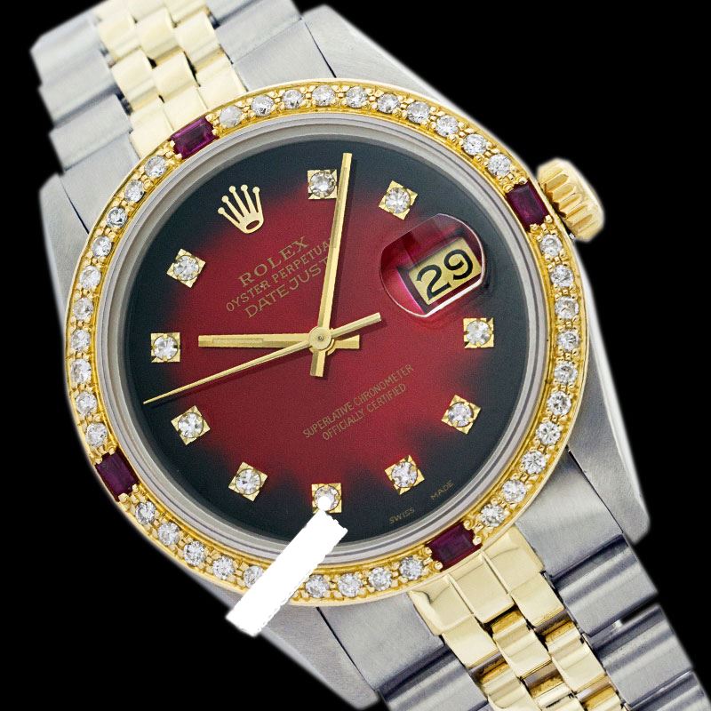 WATCH DETAILS: ITEM: WatchBRAND: RolexTYPE: Two ToneFEATURE: MODEL: DateJustMADE: Swiss MadeGENDER: LadiesCONDITION: Pre-OwnedFUNCTION: DateDIAL COLOR: RedHOUR MARKERS: 10 Round Custom Made DiamondBEZEL TYPE: Custom Made Diamond & Ruby BezelBEZEL STONE: Diamond G-VVS1 & 4 Burmise RubyBEZEL MATERIAL: 18K GoldBRACELET TYPE: Jubilee BRACELET MATERIAL: 14K Yellow Gold & Stainless SteelCLASP TYPE: Folding ClaspCLASP MATERIAL: Stainless SteelCASE STONE: CASE SIZE: 26mmCRYSTAL: Scratch Resistance Sapphire CrystalMOVEMENT: Automatic (Self Winding)CALIBER: 2030CROWN TYPE: Screw Down CrownWATER RESISTANCE: Waterproof to 10 ATM/100 meters/330 feetMODEL #: 6917SKU #: ALTJNS116We Buy/Sell/Trade Valuable watches, Please call us