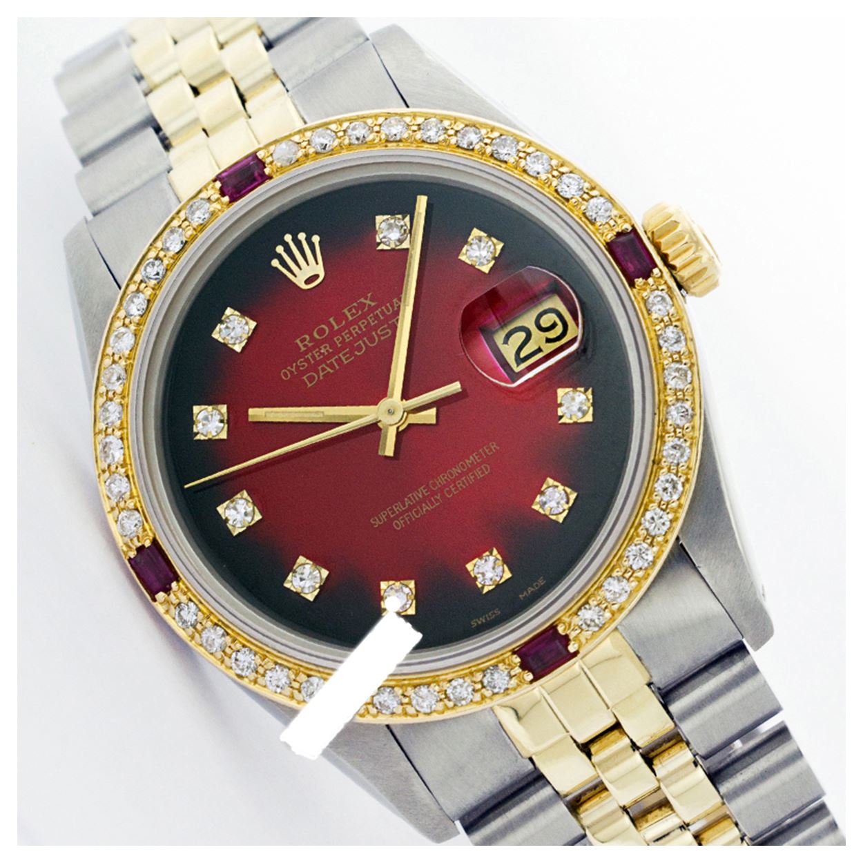 WATCH DETAILS: ITEM: WatchBRAND: RolexTYPE: Two ToneFEATURE: MODEL: DateJustMADE: Swiss MadeGENDER: LadiesCONDITION: Pre-OwnedFUNCTION: DateDIAL COLOR: RedHOUR MARKERS: 10 Round Custom Made DiamondBEZEL TYPE: Custom Made Diamond & Ruby BezelBEZEL STONE: Diamond G-VVS1 & 4 Burmise RubyBEZEL MATERIAL: 18K GoldBRACELET TYPE: Jubilee BRACELET MATERIAL: 14K Yellow Gold & Stainless SteelCLASP TYPE: Folding ClaspCLASP MATERIAL: Stainless SteelCASE STONE: CASE SIZE: 26mmCRYSTAL: Scratch Resistance Sapphire CrystalMOVEMENT: Automatic (Self Winding)CALIBER: 2030CROWN TYPE: Screw Down CrownWATER RESISTANCE: Waterproof to 10 ATM/100 meters/330 feetMODEL #: 6917SKU #: ALTJNS116We Buy/Sell/Trade Valuable watches, Please call us