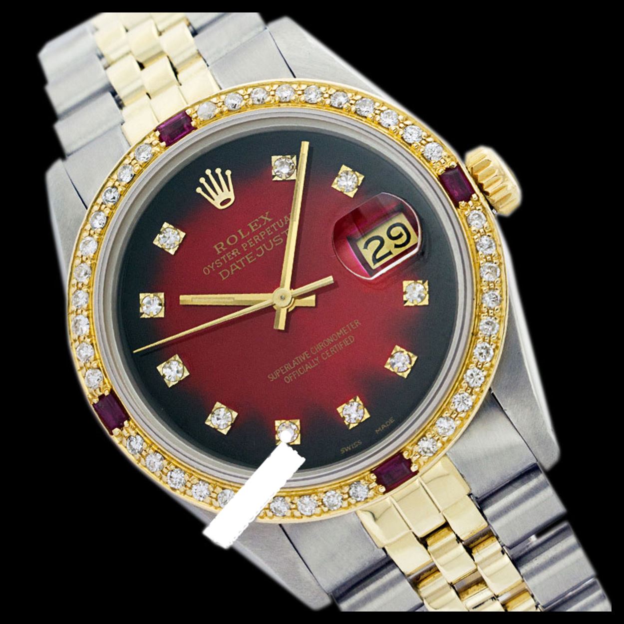 WATCH DETAILS: ITEM: WatchBRAND: RolexTYPE: Two ToneFEATURE: MODEL: DateJustMADE: Swiss MadeGENDER: LadiesCONDITION: Pre-OwnedFUNCTION: DateDIAL COLOR: RedHOUR MARKERS: 10 Round Custom Made DiamondBEZEL TYPE: Custom Made Diamond & Ruby BezelBEZEL STONE: Diamond G-VVS1 & 4 Burmise RubyBEZEL MATERIAL: 18K GoldBRACELET TYPE: Jubilee BRACELET MATERIAL: 14K Yellow Gold & Stainless SteelCLASP TYPE: Folding ClaspCLASP MATERIAL: Stainless SteelCASE STONE: CASE SIZE: 26mmCRYSTAL: Scratch Resistance Sapphire CrystalMOVEMENT: Automatic (Self Winding)CALIBER: 2030CROWN TYPE: Screw Down CrownWATER RESISTANCE: Waterproof to 10 ATM/100 meters/330 feetMODEL #: 6917SKU #: ALTJNS116We Buy/Sell/Trade Valuable watches, Please call us