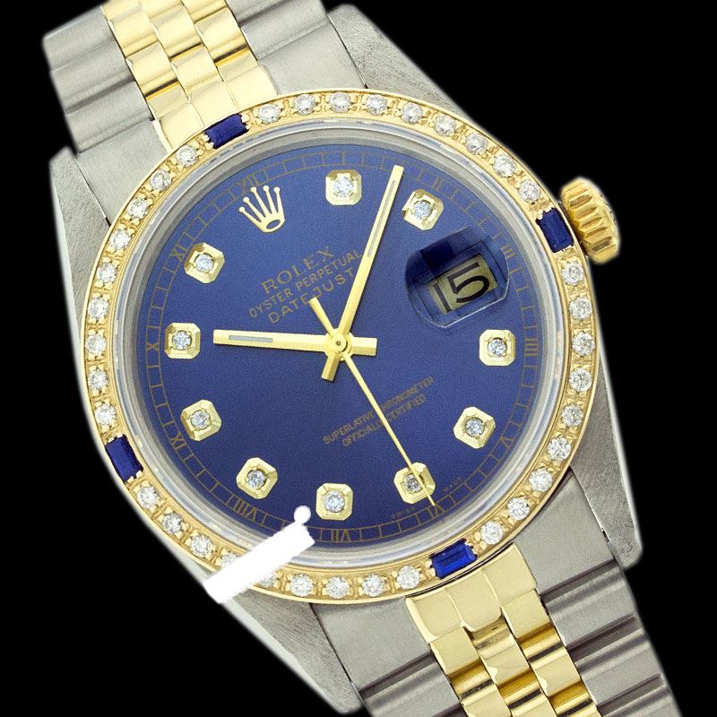 WATCH DETAILS: ITEM: WatchBRAND: RolexTYPE: Two ToneFEATURE: MODEL: DateJustMADE: Swiss MadeGENDER: LadiesCONDITION: Pre-OwnedFUNCTION: DateDIAL COLOR: BlueHOUR MARKERS: 10 Round Custom Made DiamondBEZEL TYPE: Custom Made Diamond & Sapphire BezelBEZEL STONE: Diamond G-VVS1 & Ceylon Blue SapphireBEZEL MATERIAL: 18K GoldBRACELET TYPE: Jubilee BRACELET MATERIAL: 14K Yellow Gold & Stainless SteelCLASP TYPE: Folding ClaspCLASP MATERIAL: Stainless SteelCASE STONE: CASE SIZE: 26mmCRYSTAL: Scratch Resistance Sapphire CrystalMOVEMENT: Automatic (Self Winding)CALIBER: 2030CROWN TYPE: Screw Down CrownWATER RESISTANCE: Waterproof to 10 ATM/100 meters/330 feetMODEL #: 6917SKU #: ALTJNS113We Buy/Sell/Trade Valuable watches, Please call us