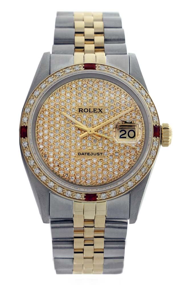 WATCH DETAILS: ITEM: WatchBRAND: RolexTYPE: Two ToneFEATURE: MODEL: DateJustMADE: Swiss MadeGENDER: LadiesCONDITION: Pre-OwnedFUNCTION: DateDIAL COLOR: GoldHOUR MARKERS: Full Custom Made Diamond PaveBEZEL TYPE: Custom Made Diamond & Ruby BezelBEZEL STONE: Diamond G-VVS1 & 4 Burmise RubyBEZEL MATERIAL: 18K GoldBRACELET TYPE: Jubilee BRACELET MATERIAL: 14K Yellow Gold & Stainless SteelCLASP TYPE: Folding ClaspCLASP MATERIAL: Stainless SteelCASE STONE: CASE SIZE: 26mmCRYSTAL: Scratch Resistance Sapphire CrystalMOVEMENT: Automatic (Self Winding)CALIBER: 2030CROWN TYPE: Screw Down CrownWATER RESISTANCE: Waterproof to 10 ATM/100 meters/330 feetMODEL #: 6917SKU #: ALTJNS80We Buy/Sell/Trade Valuable watches, Please call us