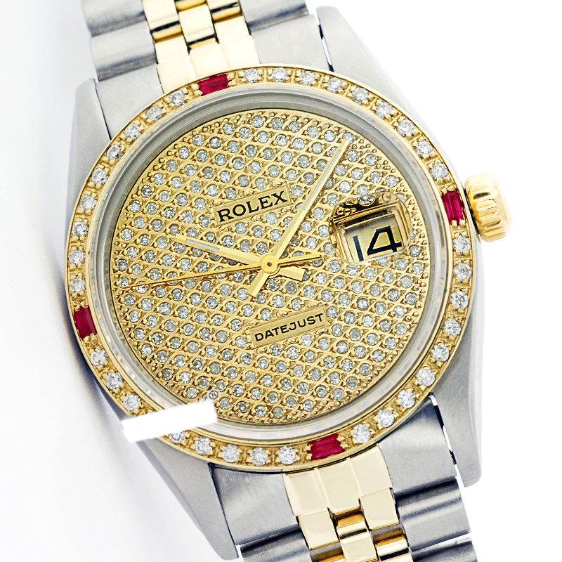 WATCH DETAILS: ITEM: WatchBRAND: RolexTYPE: Two ToneFEATURE: MODEL: DateJustMADE: Swiss MadeGENDER: LadiesCONDITION: Pre-OwnedFUNCTION: DateDIAL COLOR: GoldHOUR MARKERS: Full Custom Made Diamond PaveBEZEL TYPE: Custom Made Diamond & Ruby BezelBEZEL STONE: Diamond G-VVS1 & 4 Burmise RubyBEZEL MATERIAL: 18K GoldBRACELET TYPE: Jubilee BRACELET MATERIAL: 14K Yellow Gold & Stainless SteelCLASP TYPE: Folding ClaspCLASP MATERIAL: Stainless SteelCASE STONE: CASE SIZE: 26mmCRYSTAL: Scratch Resistance Sapphire CrystalMOVEMENT: Automatic (Self Winding)CALIBER: 2030CROWN TYPE: Screw Down CrownWATER RESISTANCE: Waterproof to 10 ATM/100 meters/330 feetMODEL #: 6917SKU #: ALTJNS109We Buy/Sell/Trade Valuable watches, Please call us