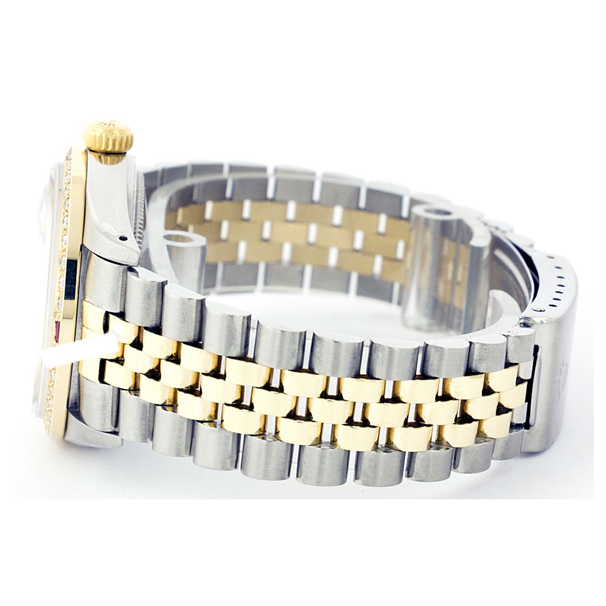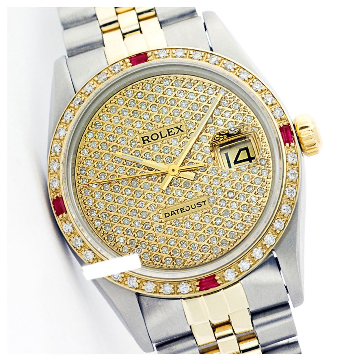 WATCH DETAILS: ITEM:     WatchBRAND:     RolexTYPE:     Two ToneFEATURE:     MODEL:     DateJustMADE:     Swiss MadeGENDER:     LadiesCONDITION:     Pre-OwnedFUNCTION:     DateDIAL COLOR:     GoldHOUR MARKERS:     Full Custom Made Diamond PaveBEZEL TYPE:     Custom Made Diamond & Ruby BezelBEZEL STONE:     Diamond G-VVS1  & 4 Burmise RubyBEZEL MATERIAL:     18K GoldBRACELET TYPE:     Jubilee BRACELET MATERIAL:     14K Yellow Gold & Stainless SteelCLASP TYPE:     Folding ClaspCLASP MATERIAL:     Stainless SteelCASE STONE:     CASE SIZE:     26mmCRYSTAL:      Scratch Resistance Sapphire CrystalMOVEMENT:     Automatic (Self Winding)CALIBER:     2030CROWN TYPE:     Screw Down CrownWATER RESISTANCE:     Waterproof to 10 ATM/100 meters/330 feetMODEL #:     6917SKU #:     ALTJNS109We Buy/Sell/Trade Valuable watches, Please call us