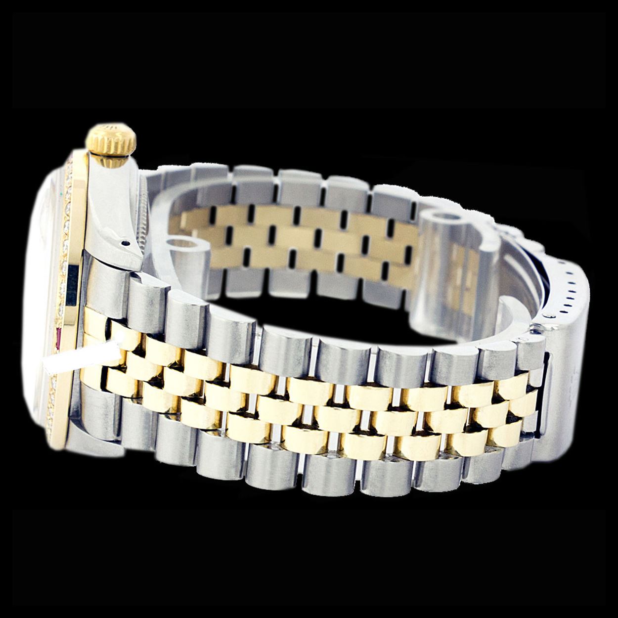 WATCH DETAILS: ITEM: WatchBRAND: RolexTYPE: Two ToneFEATURE: MODEL: DateJustMADE: Swiss MadeGENDER: LadiesCONDITION: Pre-OwnedFUNCTION: DateDIAL COLOR: GoldHOUR MARKERS: Full Custom Made Diamond PaveBEZEL TYPE: Custom Made Diamond & Ruby BezelBEZEL STONE: Diamond G-VVS1 & 4 Burmise RubyBEZEL MATERIAL: 18K GoldBRACELET TYPE: Jubilee BRACELET MATERIAL: 14K Yellow Gold & Stainless SteelCLASP TYPE: Folding ClaspCLASP MATERIAL: Stainless SteelCASE STONE: CASE SIZE: 26mmCRYSTAL: Scratch Resistance Sapphire CrystalMOVEMENT: Automatic (Self Winding)CALIBER: 2030CROWN TYPE: Screw Down CrownWATER RESISTANCE: Waterproof to 10 ATM/100 meters/330 feetMODEL #: 6917SKU #: ALTJNS109We Buy/Sell/Trade Valuable watches, Please call us