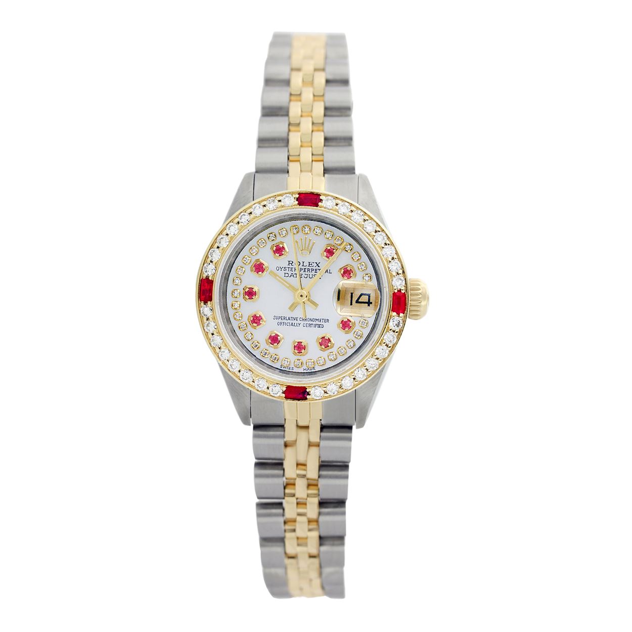 WATCH DETAILS: ITEM: WatchBRAND: RolexTYPE: Two ToneFEATURE: MODEL: DateJustMADE: Swiss MadeGENDER: LadiesCONDITION: Pre-OwnedFUNCTION: DateDIAL COLOR: WhiteHOUR MARKERS: String Custom Made Diamond + 10 Round RubyBEZEL TYPE: Custom Made Diamond & Ruby BezelBEZEL STONE: Diamond G-VVS1 & 4 Burmise RubyBEZEL MATERIAL: 18K GoldBRACELET TYPE: Jubilee BRACELET MATERIAL: 14K Yellow Gold & Stainless SteelCLASP TYPE: Folding ClaspCLASP MATERIAL: Stainless SteelCASE STONE: CASE SIZE: 26mmCRYSTAL: Scratch Resistance Sapphire CrystalMOVEMENT: Automatic (Self Winding)CALIBER: 2030CROWN TYPE: Screw Down CrownWATER RESISTANCE: Waterproof to 10 ATM/100 meters/330 feetMODEL #: 6917SKU #: ALTJNS73We Buy/Sell/Trade Valuable watches, Please call us