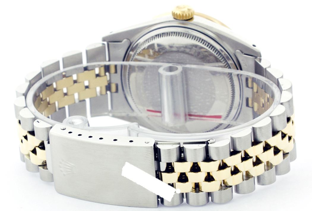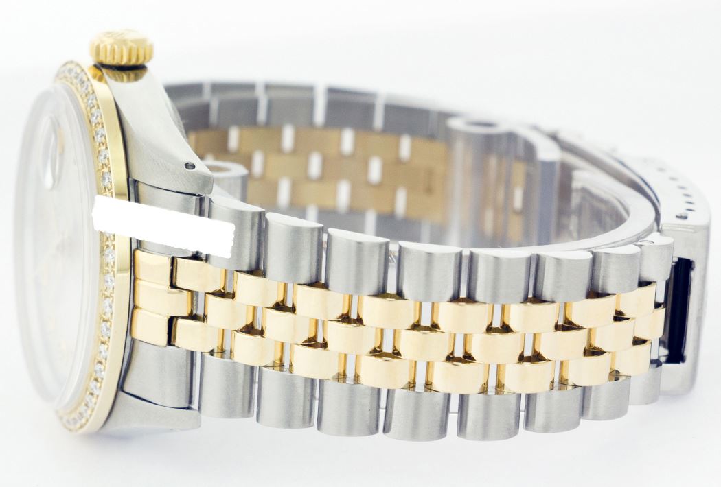 WATCH DETAILS: ITEM: WatchBRAND: RolexTYPE: Two ToneFEATURE: MODEL: DateJustMADE: Swiss MadeGENDER: LadiesCONDITION: Pre-OwnedFUNCTION: DateDIAL COLOR: SilverHOUR MARKERS: 10 Round Custom Made DiamondBEZEL TYPE: Custom Made Diamond BezelBEZEL STONE: Diamond .80 CTW G-VVS1 BEZEL MATERIAL: 18K GoldBRACELET TYPE: Jubilee BRACELET MATERIAL: 14K Yellow Gold & Stainless SteelCLASP TYPE: Folding ClaspCLASP MATERIAL: Stainless SteelCASE STONE: CASE SIZE: 26mmCRYSTAL: Scratch Resistance Sapphire CrystalMOVEMENT: Automatic (Self Winding)CALIBER: 2030CROWN TYPE: Screw Down CrownWATER RESISTANCE: Waterproof to 10 ATM/100 meters/330 feetMODEL #: 6917SKU #: ALTJNS117We Buy/Sell/Trade Valuable watches, Please call us