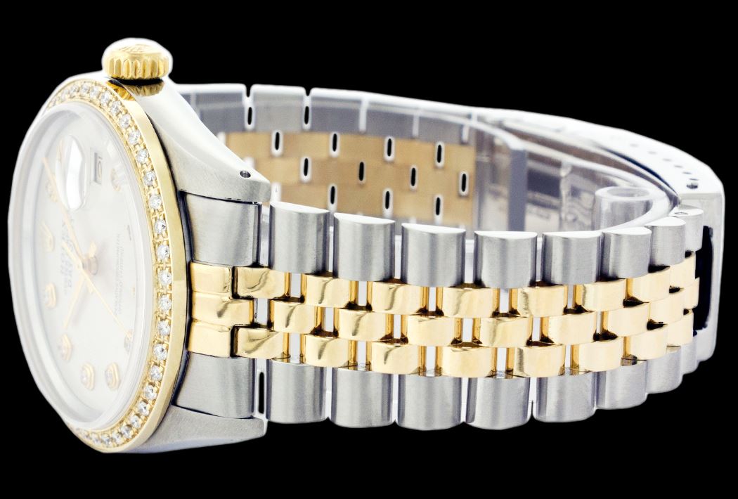 WATCH DETAILS: ITEM: WatchBRAND: RolexTYPE: Two ToneFEATURE: MODEL: DateJustMADE: Swiss MadeGENDER: LadiesCONDITION: Pre-OwnedFUNCTION: DateDIAL COLOR: whiteHOUR MARKERS: 10 Round Custom Made DiamondBEZEL TYPE: Custom Made Diamond BezelBEZEL STONE: Diamond .80 CTW G-VVS1 BEZEL MATERIAL: 18K GoldBRACELET TYPE: Jubilee BRACELET MATERIAL: 14K Yellow Gold & Stainless SteelCLASP TYPE: Folding ClaspCLASP MATERIAL: Stainless SteelCASE STONE: CASE SIZE: 26mmCRYSTAL: Scratch Resistance Sapphire CrystalMOVEMENT: Automatic (Self Winding)CALIBER: 2030CROWN TYPE: Screw Down CrownWATER RESISTANCE: Waterproof to 10 ATM/100 meters/330 feetMODEL #: 6917SKU #: ALTJNS18We Buy/Sell/Trade Valuable watches, Please call us