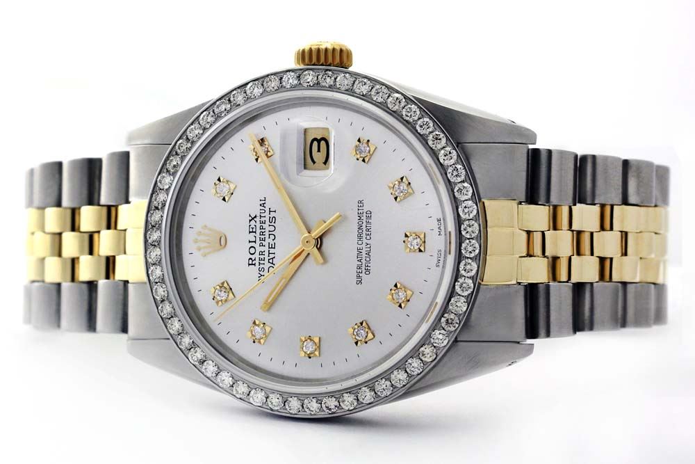 WATCH DETAILS: ITEM: WatchBRAND: RolexTYPE: Two ToneFEATURE: MODEL: DateJustMADE: Swiss MadeGENDER: LadiesCONDITION: Pre-OwnedFUNCTION: DateDIAL COLOR: whiteHOUR MARKERS: 10 Round Custom Made DiamondBEZEL TYPE: Custom Made Diamond BezelBEZEL STONE: Diamond .80 CTW G-VVS1 BEZEL MATERIAL: 18K GoldBRACELET TYPE: Jubilee BRACELET MATERIAL: 14K Yellow Gold & Stainless SteelCLASP TYPE: Folding ClaspCLASP MATERIAL: Stainless SteelCASE STONE: CASE SIZE: 26mmCRYSTAL: Scratch Resistance Sapphire CrystalMOVEMENT: Automatic (Self Winding)CALIBER: 2030CROWN TYPE: Screw Down CrownWATER RESISTANCE: Waterproof to 10 ATM/100 meters/330 feetMODEL #: 6917SKU #: ALTJNS8We Buy/Sell/Trade Valuable watches, Please call us
