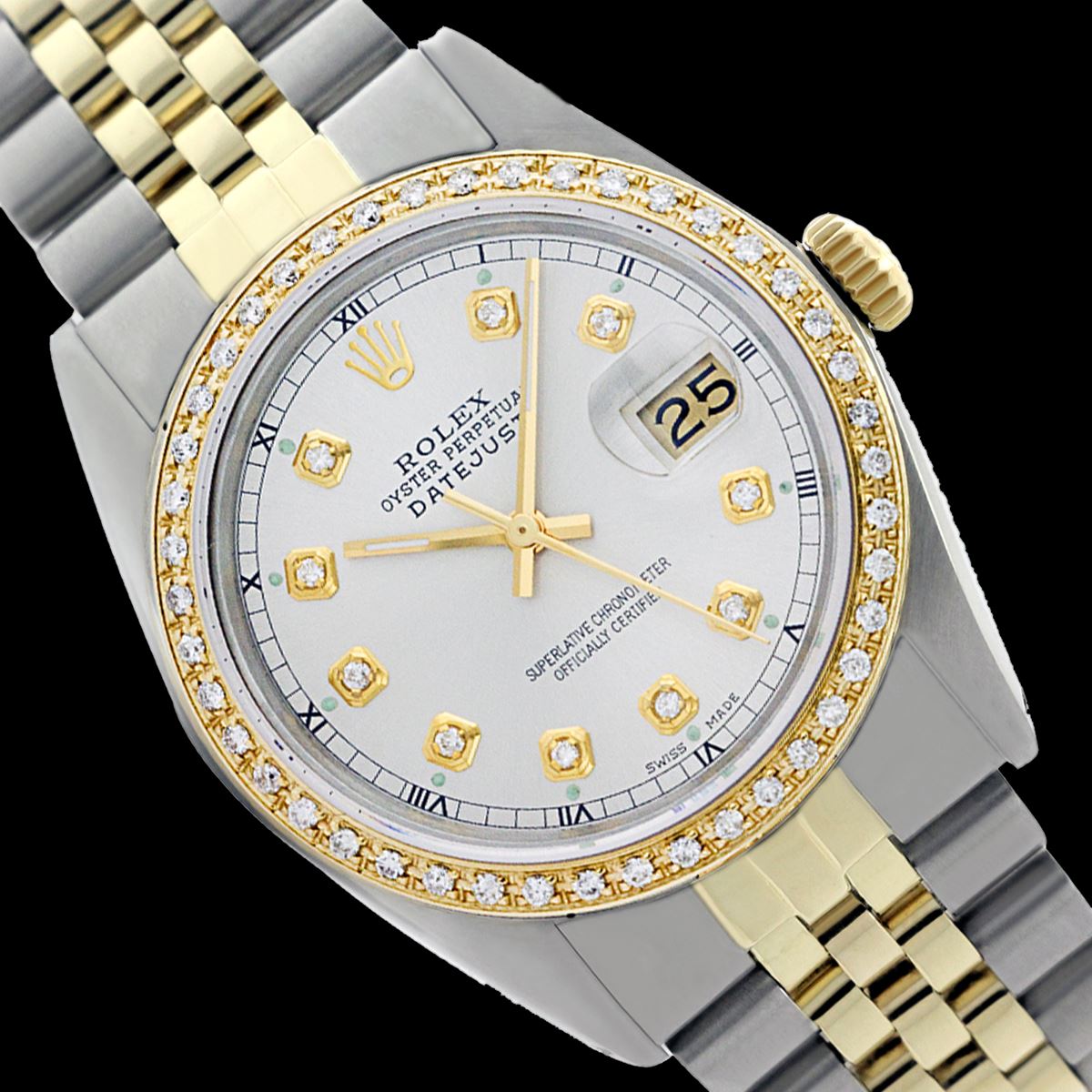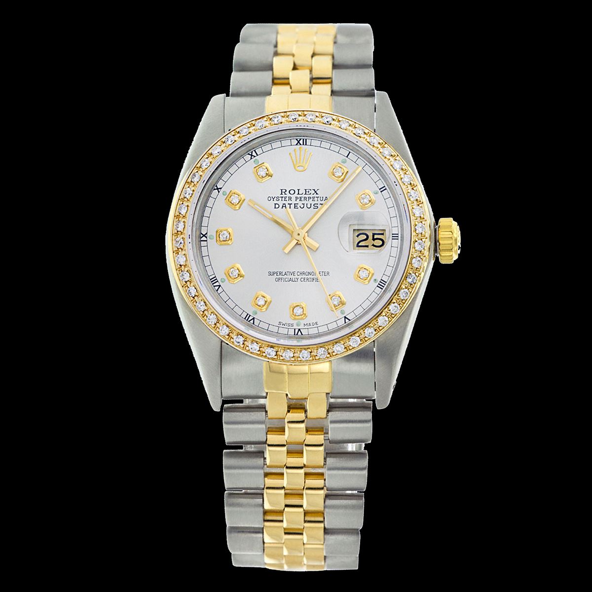 WATCH DETAILS: ITEM: WatchBRAND: RolexTYPE: Two ToneFEATURE: MODEL: DateJustMADE: Swiss MadeGENDER: LadiesCONDITION: Pre-OwnedFUNCTION: DateDIAL COLOR: whiteHOUR MARKERS: 10 Round Custom Made DiamondBEZEL TYPE: Custom Made Diamond BezelBEZEL STONE: Diamond .80 CTW G-VVS1 BEZEL MATERIAL: 18K GoldBRACELET TYPE: Jubilee BRACELET MATERIAL: 14K Yellow Gold & Stainless SteelCLASP TYPE: Folding ClaspCLASP MATERIAL: Stainless SteelCASE STONE: CASE SIZE: 26mmCRYSTAL: Scratch Resistance Sapphire CrystalMOVEMENT: Automatic (Self Winding)CALIBER: 2030CROWN TYPE: Screw Down CrownWATER RESISTANCE: Waterproof to 10 ATM/100 meters/330 feetMODEL #: 6917SKU #: ALTJNS41We Buy/Sell/Trade Valuable watches, Please call us