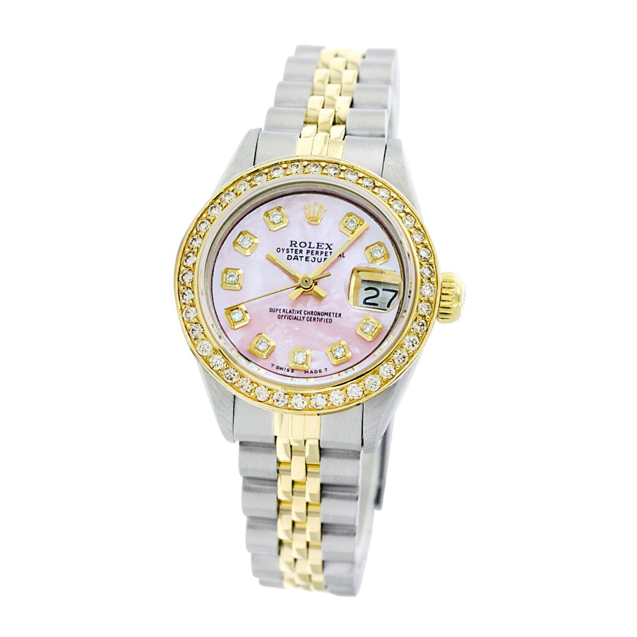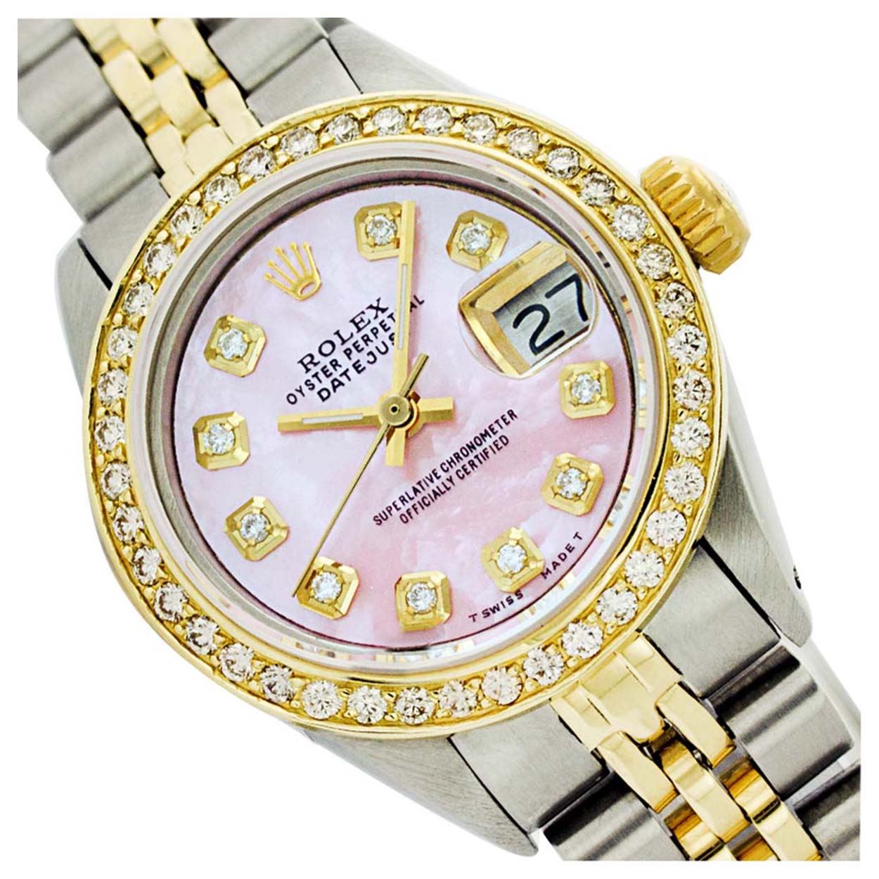 WATCH DETAILS: ITEM: WatchBRAND: RolexTYPE: Two ToneFEATURE: MODEL: DateJustMADE: Swiss MadeGENDER: LadiesCONDITION: Pre-OwnedFUNCTION: DateDIAL COLOR: PinkHOUR MARKERS: 10 Round Custom Made DiamondBEZEL TYPE: Custom Made Diamond BezelBEZEL STONE: Diamond .80 CTW G-VVS1 BEZEL MATERIAL: 18K GoldBRACELET TYPE: Jubilee BRACELET MATERIAL: 14K Yellow Gold & Stainless SteelCLASP TYPE: Folding ClaspCLASP MATERIAL: Stainless SteelCASE STONE: CASE SIZE: 26mmCRYSTAL: Scratch Resistance Sapphire CrystalMOVEMENT: Automatic (Self Winding)CALIBER: 2030CROWN TYPE: Screw Down CrownWATER RESISTANCE: Waterproof to 10 ATM/100 meters/330 feetMODEL #: 6917SKU #: ALTJNS78We Buy/Sell/Trade Valuable watches, Please call us