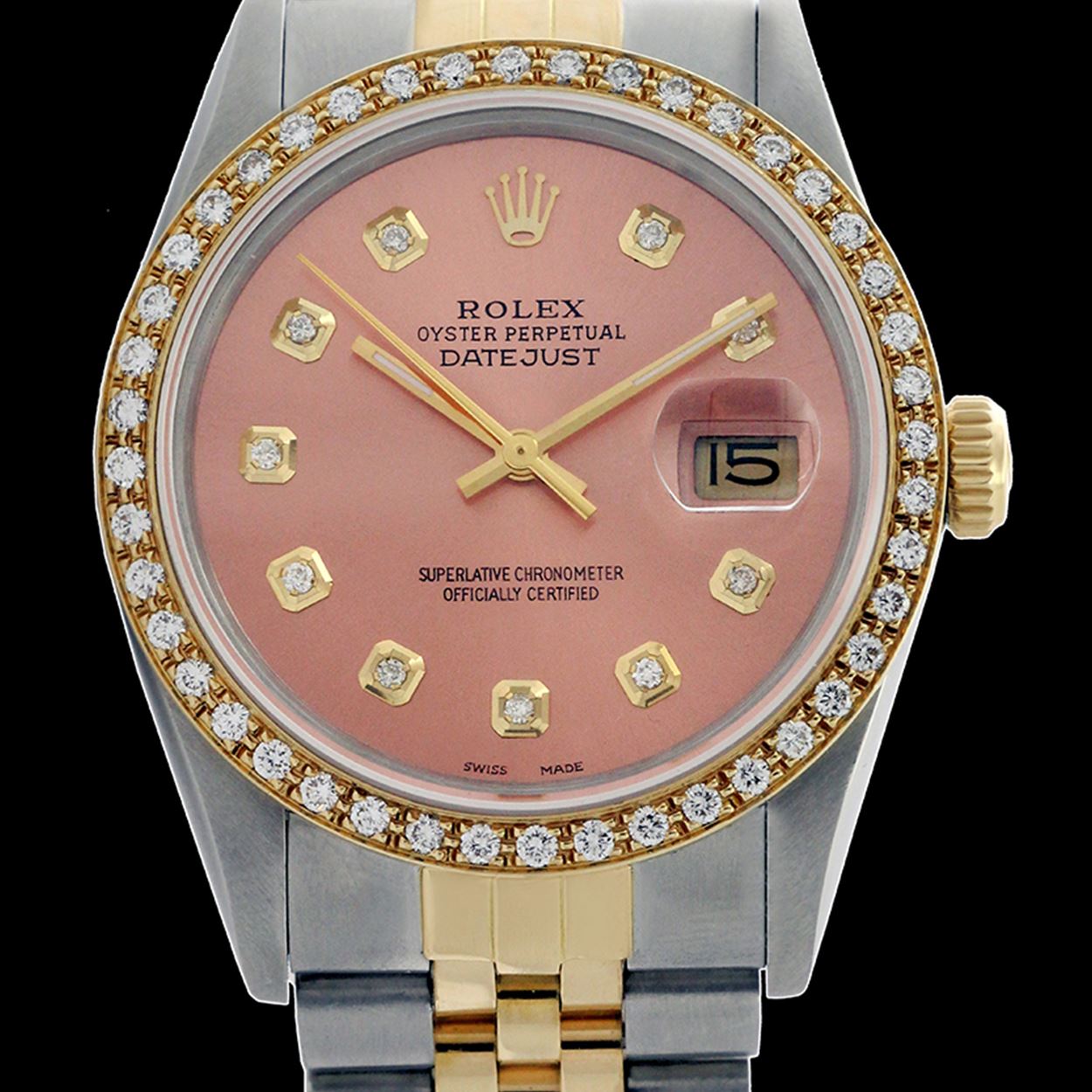 WATCH DETAILS: ITEM: WatchBRAND: RolexTYPE: Two ToneFEATURE: MODEL: DateJustMADE: Swiss MadeGENDER: LadiesCONDITION: Pre-OwnedFUNCTION: DateDIAL COLOR: PinkHOUR MARKERS: 10 Round Custom Made DiamondBEZEL TYPE: Custom Made Diamond BezelBEZEL STONE: Diamond .80 CTW G-VVS1 BEZEL MATERIAL: 18K GoldBRACELET TYPE: Jubilee BRACELET MATERIAL: 14K Yellow Gold & Stainless SteelCLASP TYPE: Folding ClaspCLASP MATERIAL: Stainless SteelCASE STONE: CASE SIZE: 26mmCRYSTAL: Scratch Resistance Sapphire CrystalMOVEMENT: Automatic (Self Winding)CALIBER: 2030CROWN TYPE: Screw Down CrownWATER RESISTANCE: Waterproof to 10 ATM/100 meters/330 feetMODEL #: 6917SKU #: ALTJNS72We Buy/Sell/Trade Valuable watches, Please call us