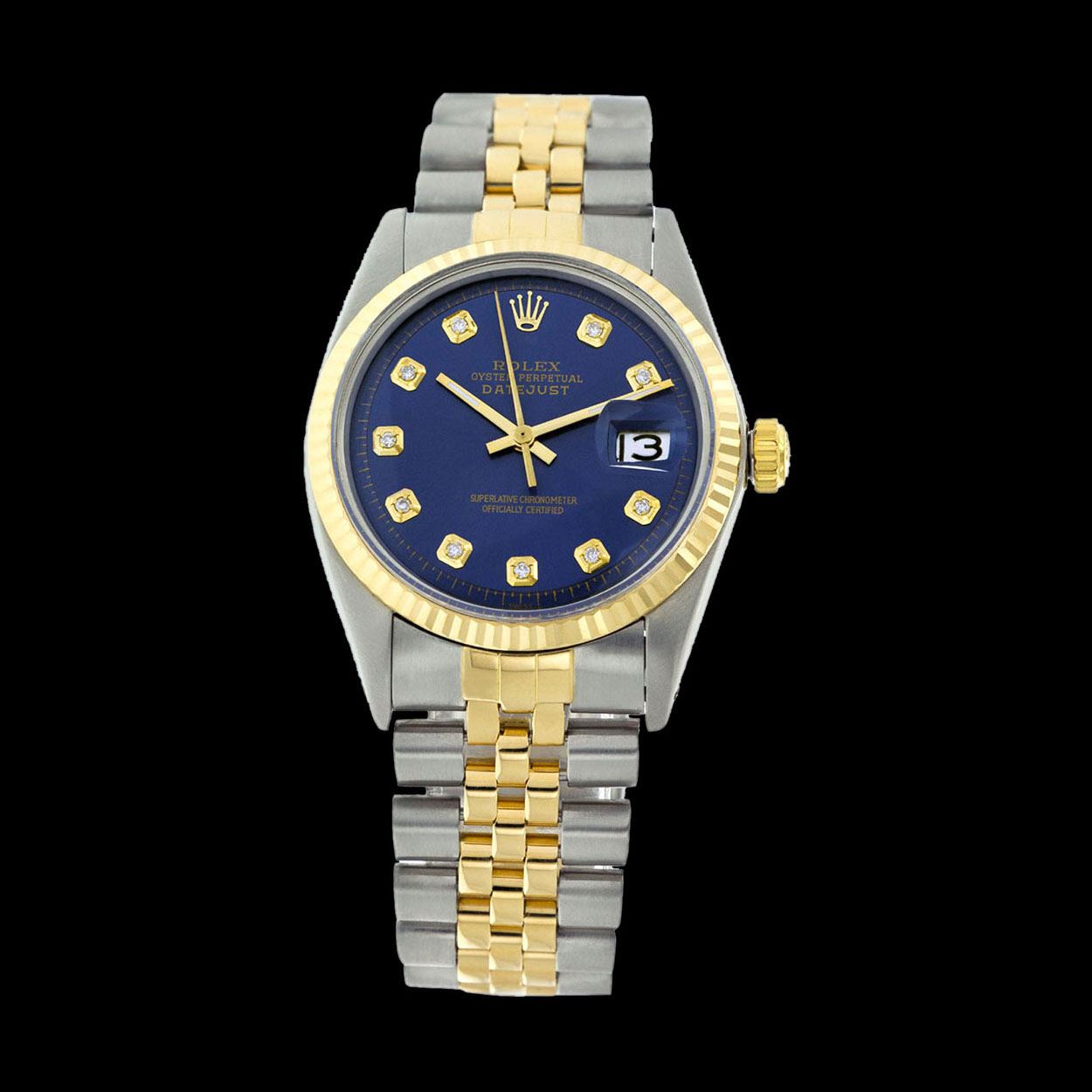 WATCH DETAILS: ITEM: WatchBRAND: RolexTYPE: Two ToneFEATURE: MODEL: DateJustMADE: Swiss MadeGENDER: LadiesCONDITION: Pre-OwnedFUNCTION: DateDIAL COLOR: Royal BlueHOUR MARKERS: 10 Round Custom Made DiamondBEZEL TYPE: Fluted BezelBEZEL STONE: No StoneBEZEL MATERIAL: 18K GoldBRACELET TYPE: Jubilee BRACELET MATERIAL: 14K Yellow Gold & Stainless SteelCLASP TYPE: Folding ClaspCLASP MATERIAL: Stainless SteelCASE STONE: CASE SIZE: 26mmCRYSTAL: Acrylic MOVEMENT: Automatic (Self Winding)CALIBER: 2030CROWN TYPE: Screw Down CrownWATER RESISTANCE: Waterproof to 10 ATM/100 meters/330 feetMODEL #: 6917SKU #: ALTJNP38We Buy/Sell/Trade Valuable watches, Please call us