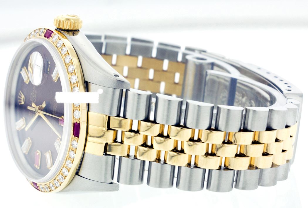 WATCH DETAILS: ITEM: WatchBRAND: RolexTYPE: Two ToneFEATURE: MODEL: DateJustMADE: Swiss MadeGENDER: LadiesCONDITION: Pre-OwnedFUNCTION: DateDIAL COLOR: BrownHOUR MARKERS: 10 Custom Made Diamond & Ruby BaguetteBEZEL TYPE: Custom Made Diamond & Ruby BezelBEZEL STONE: Diamond G-VVS1 & 4 Burmise RubyBEZEL MATERIAL: 18K GoldBRACELET TYPE: Jubilee BRACELET MATERIAL: 14K Yellow Gold & Stainless SteelCLASP TYPE: Folding ClaspCLASP MATERIAL: Stainless SteelCASE STONE: CASE SIZE: 26mmCRYSTAL: Scratch Resistance Sapphire CrystalMOVEMENT: Automatic (Self Winding)CALIBER: 2030CROWN TYPE: Screw Down CrownWATER RESISTANCE: Waterproof to 10 ATM/100 meters/330 feetMODEL #: 6917SKU #: ALTJNS12We Buy/Sell/Trade Valuable watches, Please call us