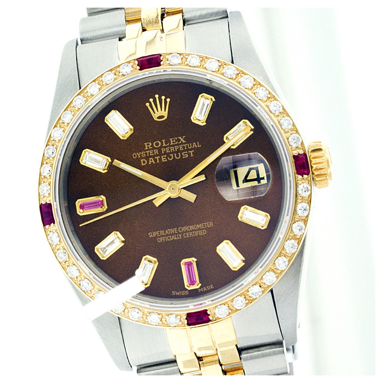WATCH DETAILS: ITEM: WatchBRAND: RolexTYPE: Two ToneFEATURE: MODEL: DateJustMADE: Swiss MadeGENDER: LadiesCONDITION: Pre-OwnedFUNCTION: DateDIAL COLOR: BrownHOUR MARKERS: 10 Custom Made Diamond & Ruby BaguetteBEZEL TYPE: Custom Made Diamond & Ruby BezelBEZEL STONE: Diamond G-VVS1 & 4 Burmise RubyBEZEL MATERIAL: 18K GoldBRACELET TYPE: Jubilee BRACELET MATERIAL: 14K Yellow Gold & Stainless SteelCLASP TYPE: Folding ClaspCLASP MATERIAL: Stainless SteelCASE STONE: CASE SIZE: 26mmCRYSTAL: Scratch Resistance Sapphire CrystalMOVEMENT: Automatic (Self Winding)CALIBER: 2030CROWN TYPE: Screw Down CrownWATER RESISTANCE: Waterproof to 10 ATM/100 meters/330 feetMODEL #: 6917SKU #: ALTJNS12We Buy/Sell/Trade Valuable watches, Please call us