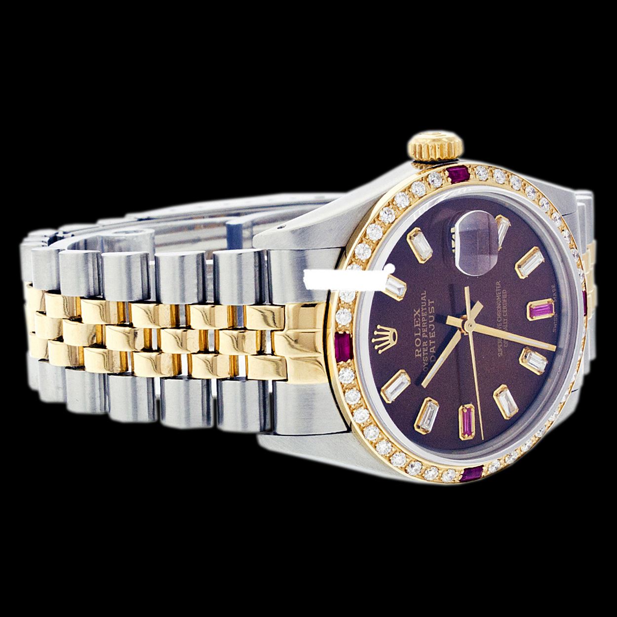 WATCH DETAILS: ITEM: WatchBRAND: RolexTYPE: Two ToneFEATURE: MODEL: DateJustMADE: Swiss MadeGENDER: LadiesCONDITION: Pre-OwnedFUNCTION: DateDIAL COLOR: BrownHOUR MARKERS: 10 Custom Made Diamond & Ruby BaguetteBEZEL TYPE: Custom Made Diamond & Ruby BezelBEZEL STONE: Diamond G-VVS1 & 4 Burmise RubyBEZEL MATERIAL: 18K GoldBRACELET TYPE: Jubilee BRACELET MATERIAL: 14K Yellow Gold & Stainless SteelCLASP TYPE: Folding ClaspCLASP MATERIAL: Stainless SteelCASE STONE: CASE SIZE: 26mmCRYSTAL: Scratch Resistance Sapphire CrystalMOVEMENT: Automatic (Self Winding)CALIBER: 2030CROWN TYPE: Screw Down CrownWATER RESISTANCE: Waterproof to 10 ATM/100 meters/330 feetMODEL #: 6917SKU #: ALTJNS12We Buy/Sell/Trade Valuable watches, Please call us