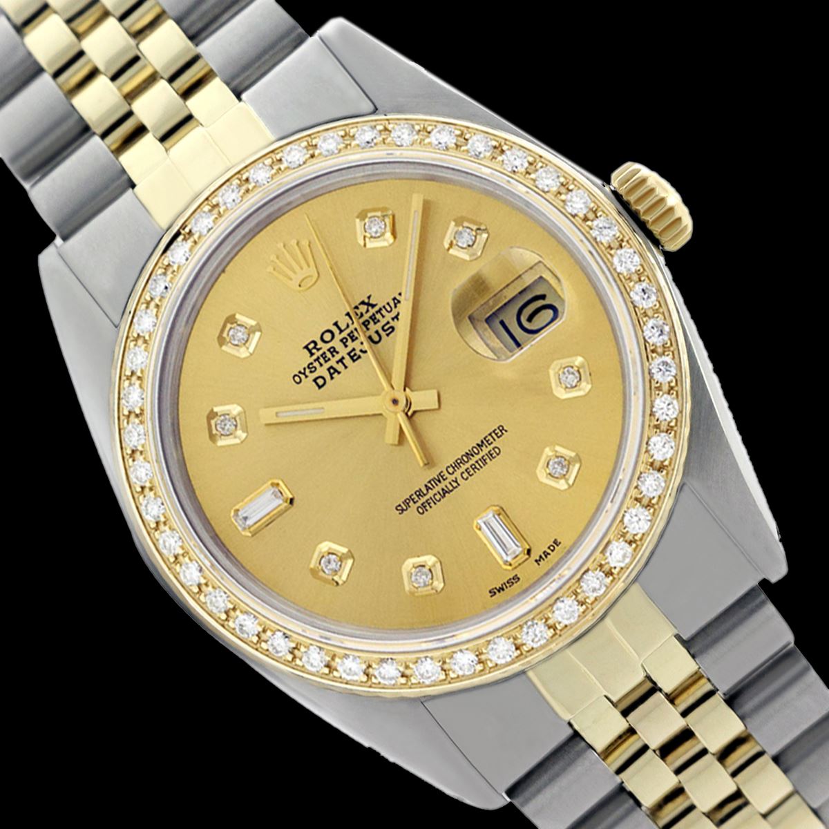 WATCH DETAILS: ITEM: WatchBRAND: RolexTYPE: Two ToneFEATURE: MODEL: DateJustMADE: Swiss MadeGENDER: LadiesCONDITION: Pre-OwnedFUNCTION: DateDIAL COLOR: ChampagneHOUR MARKERS: 8 Round & 2 Baguette Custom Made DiamondBEZEL TYPE: Custom Made Diamond BezelBEZEL STONE: Diamond .80 CTW G-VVS1 BEZEL MATERIAL: 18K GoldBRACELET TYPE: Jubilee BRACELET MATERIAL: 14K Yellow Gold & Stainless SteelCLASP TYPE: Folding ClaspCLASP MATERIAL: Stainless SteelCASE STONE: CASE SIZE: 26mmCRYSTAL: Scratch Resistance Sapphire CrystalMOVEMENT: Automatic (Self Winding)CALIBER: 2030CROWN TYPE: Screw Down CrownWATER RESISTANCE: Waterproof to 10 ATM/100 meters/330 feetMODEL #: 6917SKU #: ALTJNS96We Buy/Sell/Trade Valuable watches, Please call us