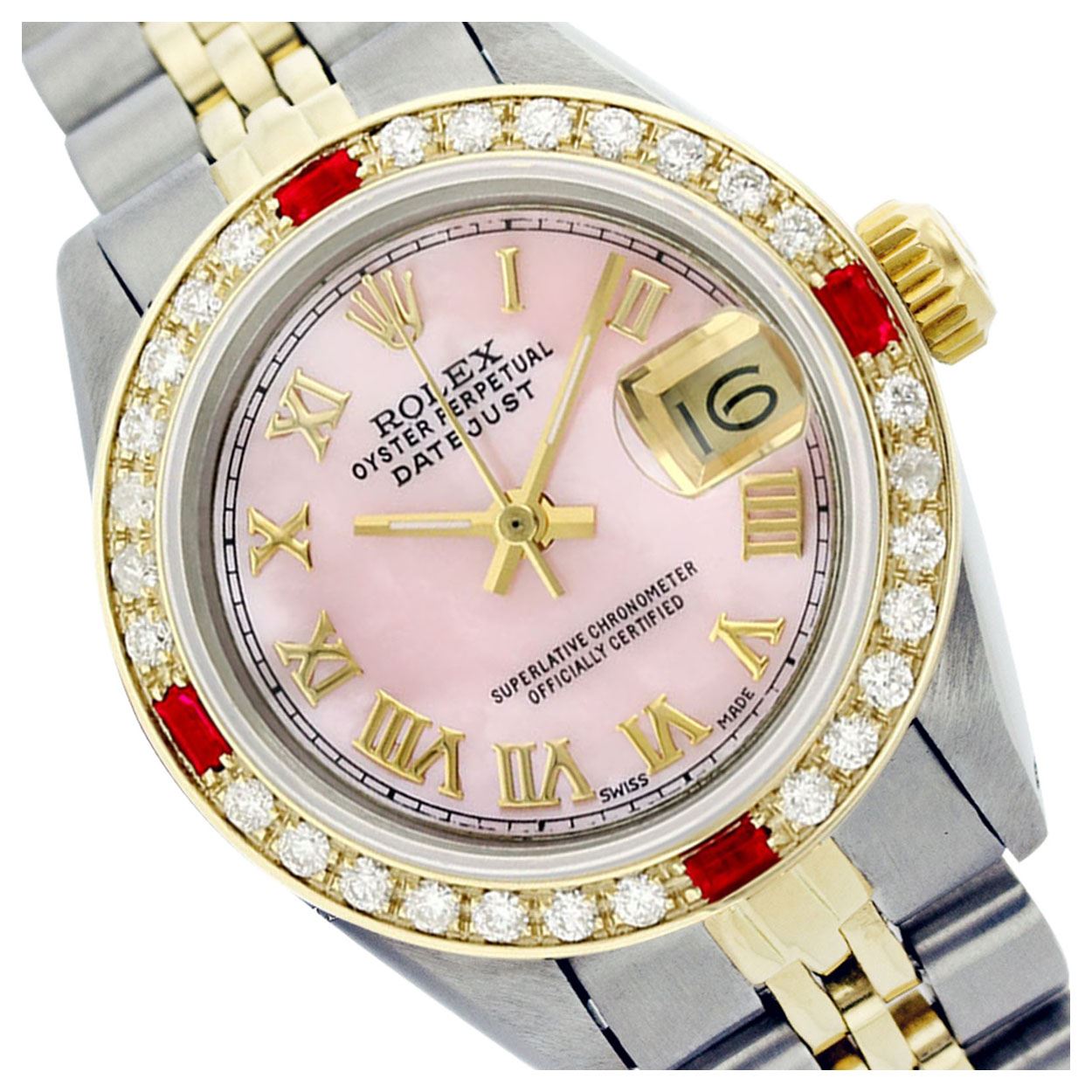REF-428Y6X ---- Rolex Ladies Two Tone 14K Gold/ss, Roman Dial with Diam/Ruby Bezel, Sapphire CrystalThis watch is in Excellent Condition.