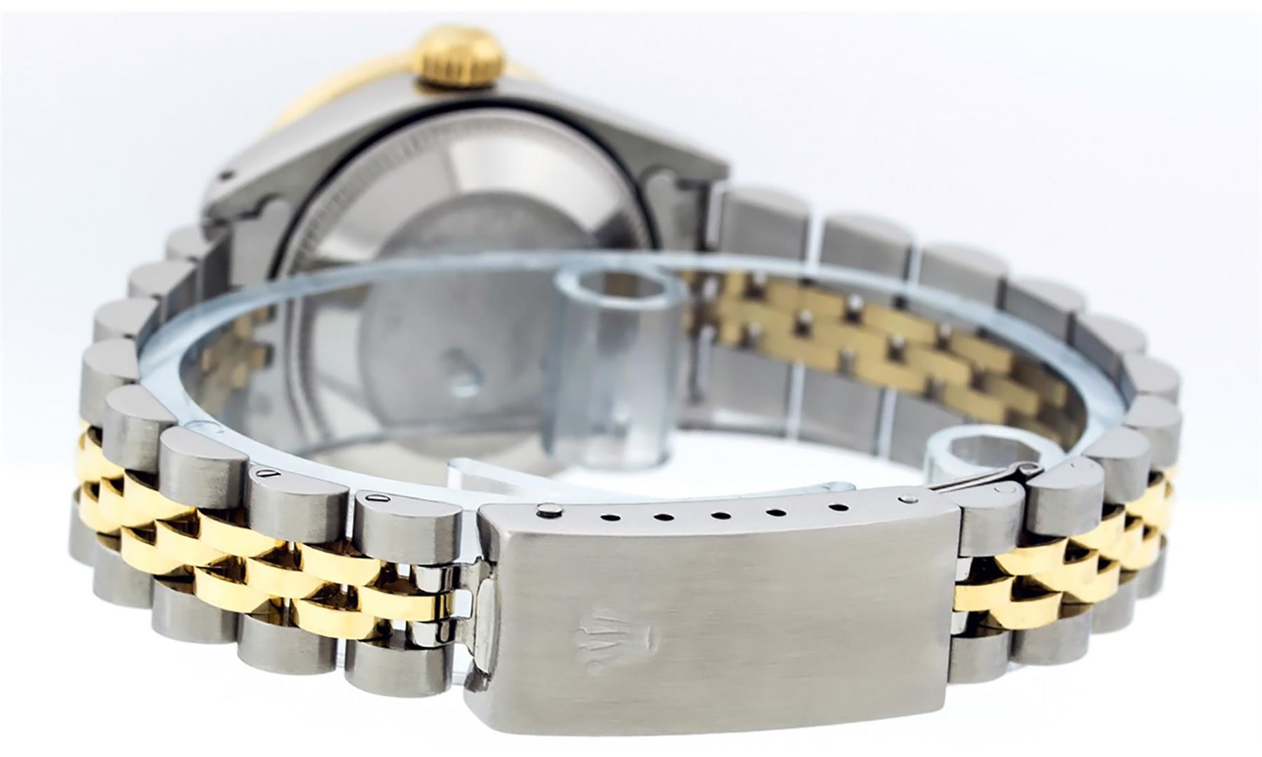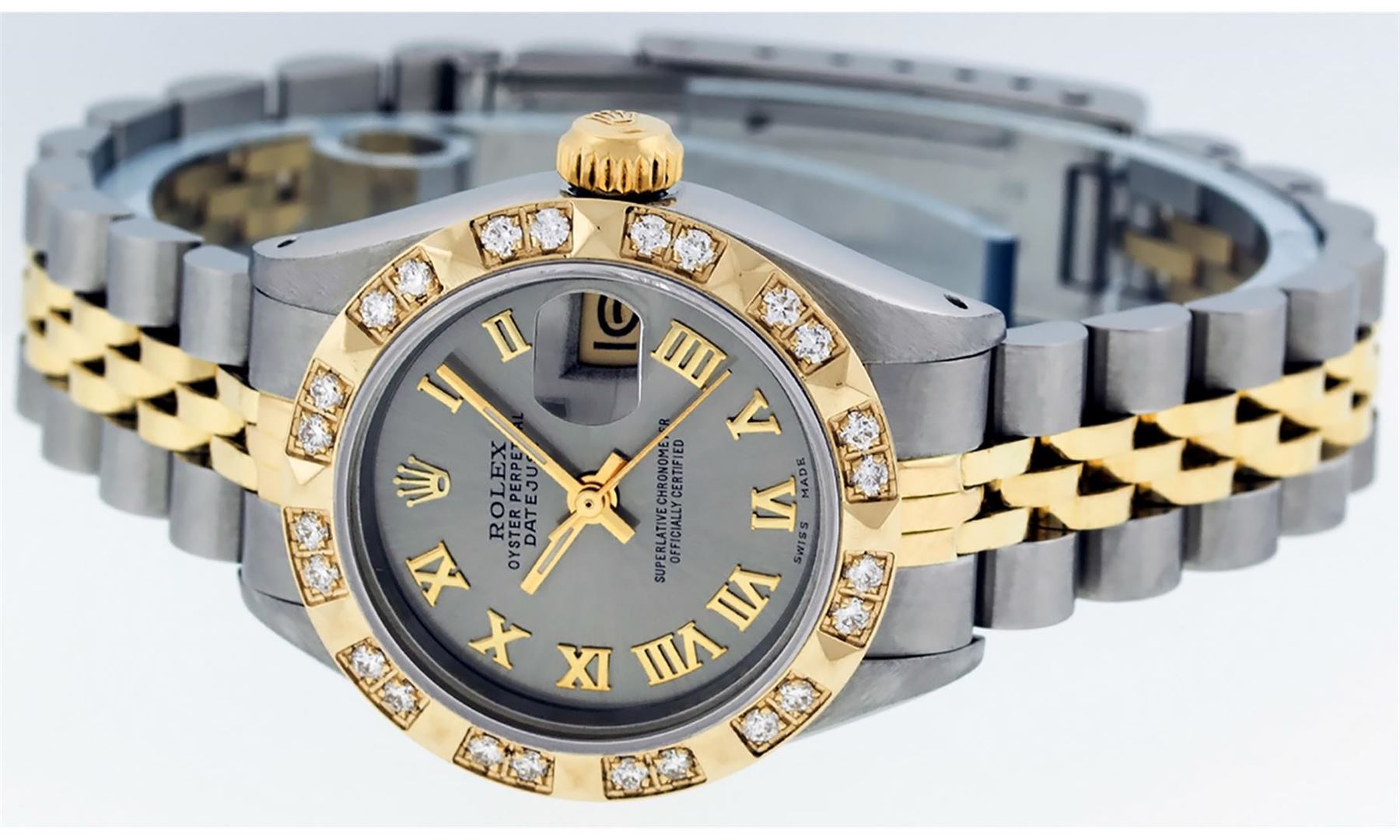 One Ladies 14K Two Tone Rolex Datejust Polished, Serviced & Electronically Tested, 14K Yellow Gold & Stainless Steel Case: 26mm, 14K Yellow Gold Crown, Custom Bezel: New 18K Yellow Gold Pyramid Diamond Bezel, Diamond Count: 24 Diamonds In Bezel. Total Weight .50 Carat, Clarity: SI-VS, Color: G to H. Custom Crystal: New Synthetic Sapphire Cyclops Lens. Custom Hands: New Luminescent Hands. Movement: Automatic Winding Movement Caliber 2030. Custom Dial: Slate Grey With Roman Hour Markers. Date Window: 3 O'clock Position Date Display, Model: Datejust. Condition: G-6 Extra Fine The Watch Is In Very Good Condition Free Of All Scratches And Dents. . Bracelet: Two Tone 14K Yellow Gold & Stainless Steel Jubilee. Bright Polish. 6.0 Inch Length, Adjustable. Standard Clasp, With Rolex Logo. This Watch Has Been Serviced Time Tested And Is In Excellent Condition It Is Free Of All Scratches And Dents.