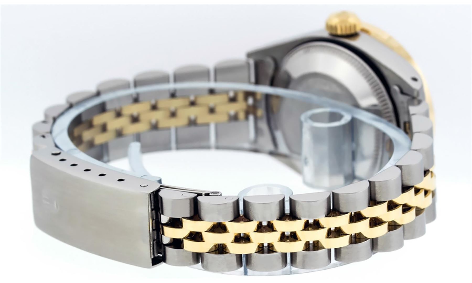 One Ladies 14K Two Tone Rolex Datejust Polished, Serviced & Electronically Tested, 14K Yellow Gold & Stainless Steel Case: 26mm, 14K Yellow Gold Crown, Custom Bezel: New 18K Yellow Gold Pyramid Diamond Bezel, Diamond Count: 24 Diamonds In Bezel. Total Weight .50 Carat, Clarity: SI-VS, Color: G to H. Custom Crystal: New Synthetic Sapphire Cyclops Lens. Custom Hands: New Luminescent Hands. Movement: Automatic Winding Movement Caliber 2030. Custom Dial: Slate Grey With Roman Hour Markers. Date Window: 3 O'clock Position Date Display, Model: Datejust. Condition: G-6 Extra Fine The Watch Is In Very Good Condition Free Of All Scratches And Dents. . Bracelet: Two Tone 14K Yellow Gold & Stainless Steel Jubilee. Bright Polish. 6.0 Inch Length, Adjustable. Standard Clasp, With Rolex Logo. This Watch Has Been Serviced Time Tested And Is In Excellent Condition It Is Free Of All Scratches And Dents.