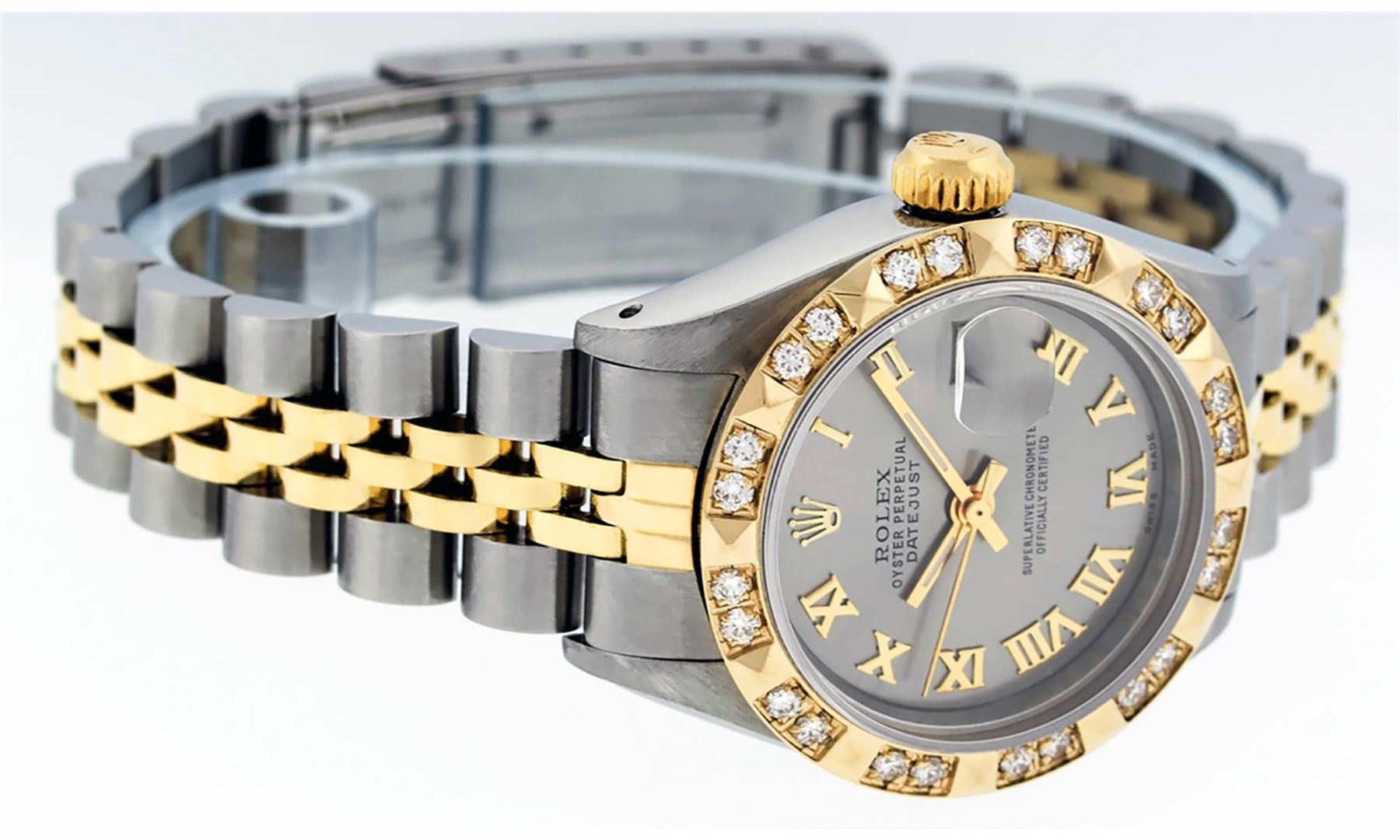 One Ladies 14K Two Tone Rolex Datejust Polished, Serviced & Electronically Tested, 14K Yellow Gold & Stainless Steel Case: 26mm, 14K Yellow Gold Crown, Custom Bezel: New 18K Yellow Gold Pyramid Diamond Bezel, Diamond Count: 24 Diamonds In Bezel. Total Weight .50 Carat, Clarity: SI-VS, Color: G to H. Custom Crystal: New Synthetic Sapphire Cyclops Lens. Custom Hands: New Luminescent Hands. Movement: Automatic Winding Movement Caliber 2030. Custom Dial: Slate Grey With Roman Hour Markers. Date Window: 3 O'clock Position Date Display, Model: Datejust. Condition: G-6 Extra Fine The Watch Is In Very Good Condition Free Of All Scratches And Dents. . Bracelet: Two Tone 14K Yellow Gold & Stainless Steel Jubilee. Bright Polish. 6.0 Inch Length, Adjustable. Standard Clasp, With Rolex Logo. This Watch Has Been Serviced Time Tested And Is In Excellent Condition It Is Free Of All Scratches And Dents.