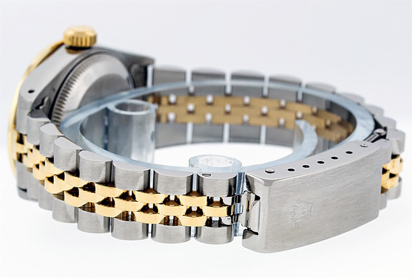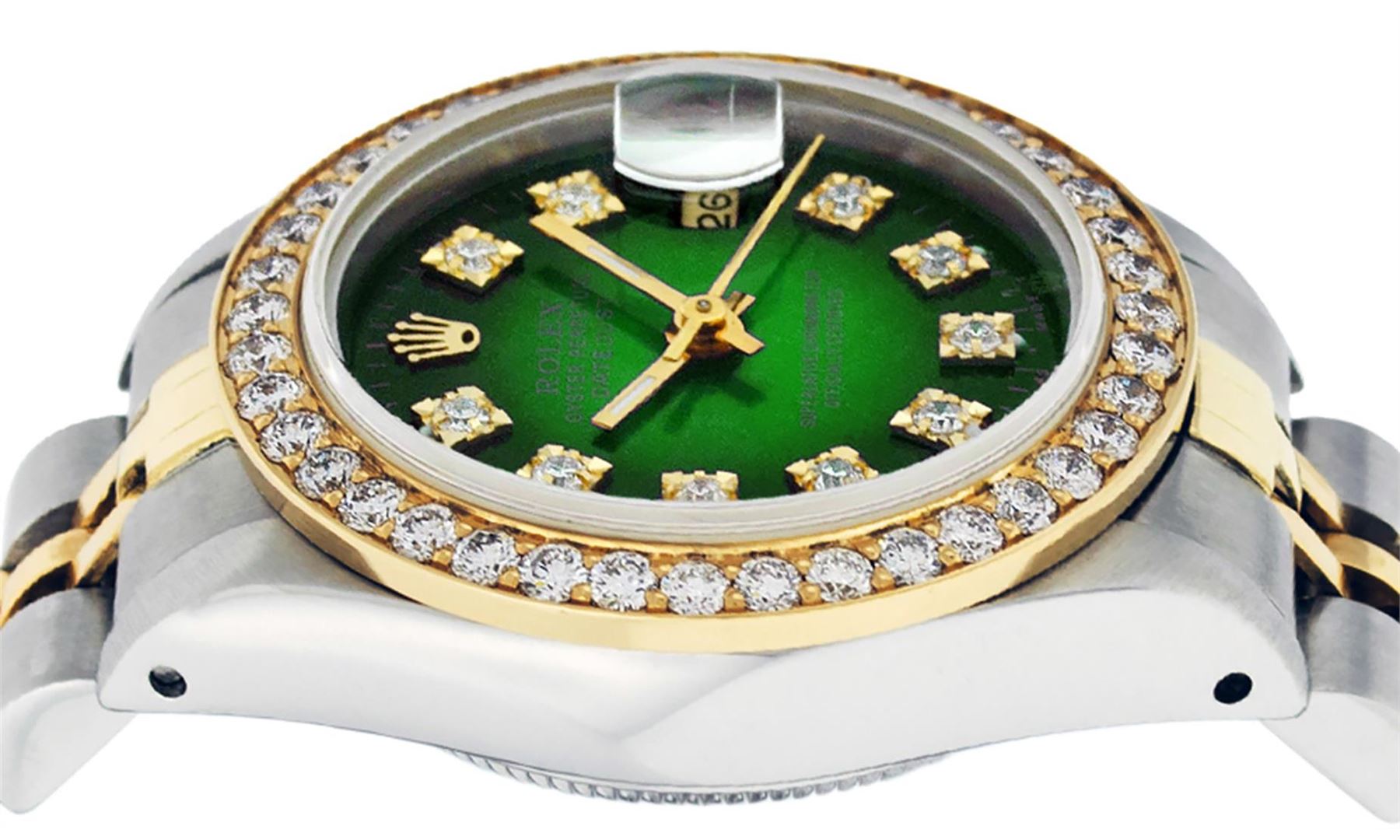 One Ladies 14K Two Tone Rolex Datejust Polished, Serviced & Electronically Tested, 14K Yellow Gold & Stainless Steel Case: 26mm, 14K Yellow Gold Crown, Custom Bezel: New 18K 1ctw Yellow Gold Beadset Diamond Bezel, Diamond Count: 42 Diamonds, Total Weight 1.00 Carat, Clarity: SI-VS, Color: G to H. Custom Crystal: New Synthetic Sapphire Cyclops Lens. Custom Hands: New Luminescent Hands. Movement: Automatic Winding Movement Caliber 2030. Custom Dial: Green Vignette VS Diamond Dial, Diamond Count: 10 Single Cut Diamonds in Dial, G To H In Color, VS Clarity. Date Window: 3 O'clock Position Date Display, Model: Datejust, Condition: G-6 Extra Fine. Bracelet: Two Tone 14K Yellow Gold & Stainless Steel Jubilee. Bright Polish. 6.0 Inch Length, Adjustable. Standard Clasp, With Rolex Logo. This Watch Has Been Serviced Time Tested And Is In Excellent Condition It Is Free Of All Scratches And Dents.