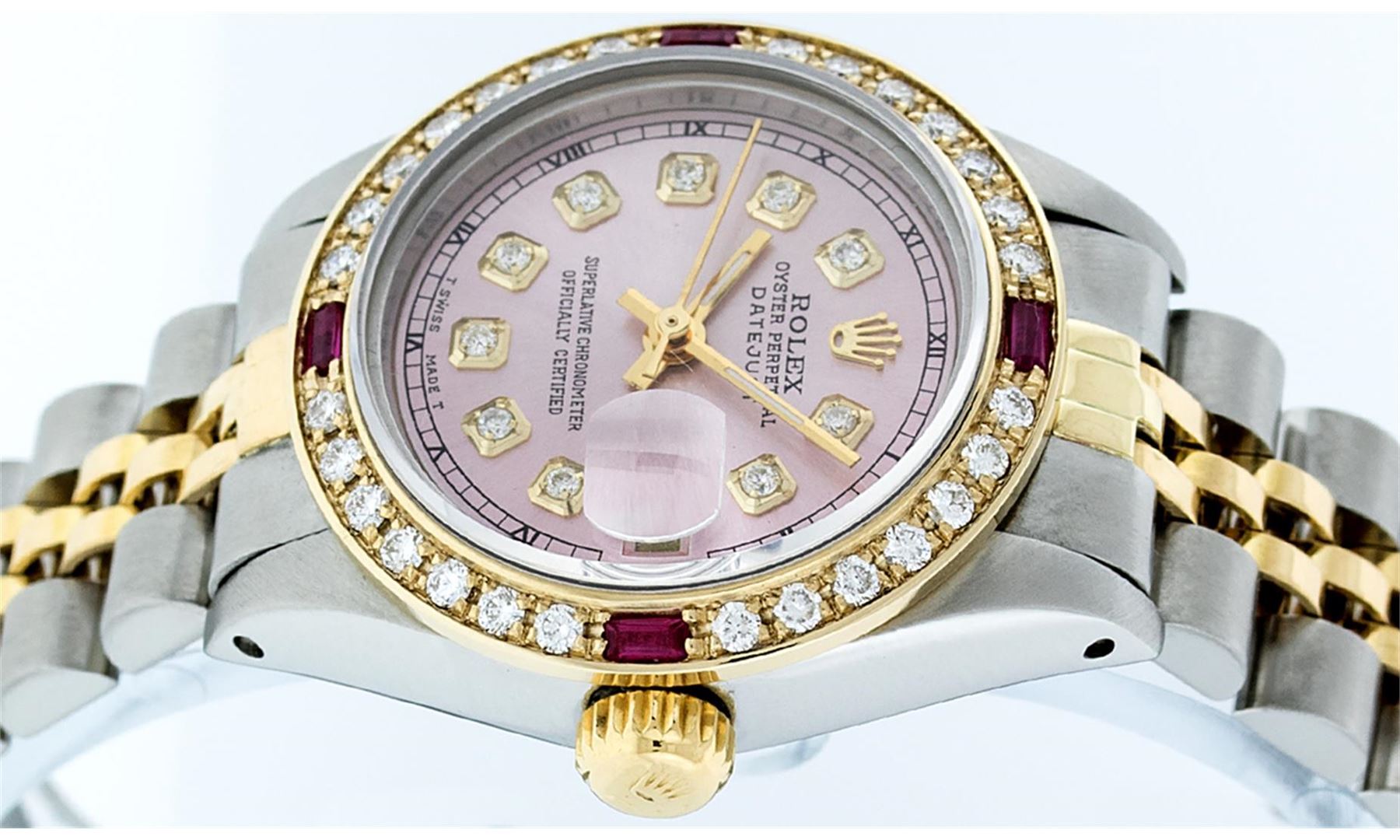 One Ladies 14K Two Tone Rolex Datejust Polished, Serviced & Electronically Tested, 14K Yellow Gold & Stainless Steel Case: 26mm, 14K Yellow Gold Crown, Custom Bezel: New 18K Yellow Gold Ruby Beadset Diamond Bezel, Diamond + Gem Count: 28 Diamonds + 4 Rubies Total Weight .70 Carat, Clarity: Si-VS, Color: G to H. Custom Crystal: New Synthetic Sapphire Cyclops Lens. Custom Hands: New Luminescent Hands. Movement: Automatic Winding Movement Caliber 2030. Custom Dial: Ice Pink Set With Diamond Hour Markers, Diamond Count: 10 Diamond in Dial, G To H In Color, Si-VS Clarity. Date Window: 3 O'Clock Position Date Display, Model: Datejust, Condition: G-6 Extra Fine. Bracelet: Two Tone 14K Yellow Gold & Stainless Steel Jubilee. Bright Polish. 6.0 Inch Length, Adjustable. Standard Clasp, With Rolex Logo. This Watch Has Been Serviced Time Tested And Is In Excellent Condition It Is Free Of All Scratches And Dents.