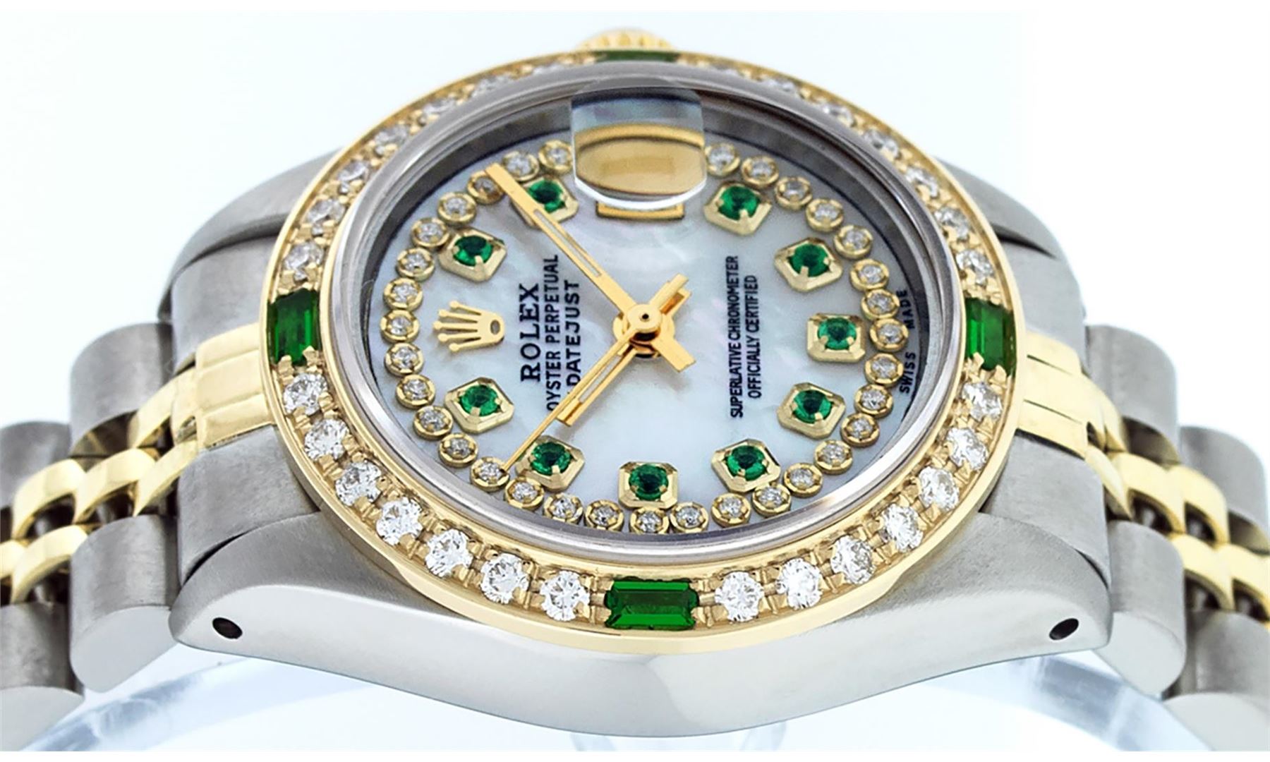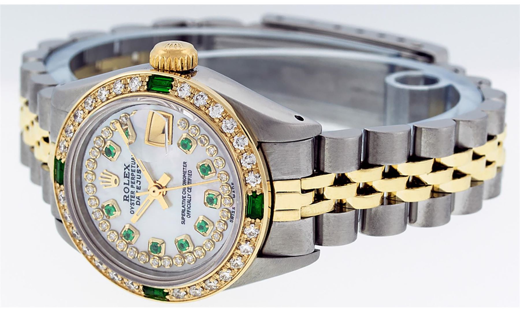 One Ladies 14K Two Tone Rolex Datejust Polished, Serviced & Electronically Tested, 14K Yellow Gold & Stainless Steel Case: 26mm, 14K Yellow Gold Crown, Custom Bezel: New 18K Yellow Gold Emerald� Beadset Diamond Bezel, Diamond Count:�28 Diamonds + 4 Emeralds�. Total Weight .70 Carat, Clarity: SI-VS, Color: G to H. Custom Crystal: New Synthetic Sapphire Cyclops Lens. Custom Hands: New Luminescent Hands. Movement: Automatic Winding Movement Caliber 2030. Custom Dial: Mother Of Pearl With Diamond String Emerald Hour Markers. 10 Emeralds + 33 Diamonds In Dial, Clarity: SI-VS, Color: G to H. Date Window: 3 O'clock Position Date Display, Model: Datejust. Condition: G-6 Extra Fine. Bracelet: Two Tone 14K Yellow Gold & Stainless Steel Jubilee. Bright Polish.�6.0 Inch Length, Adjustable. Standard Clasp, With Rolex Logo. This Watch Has Been Serviced Time Tested And Is In Excellent Condition It Is Free Of All Scratches And Dents.