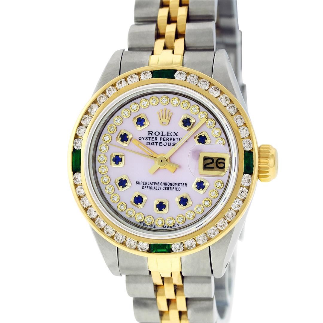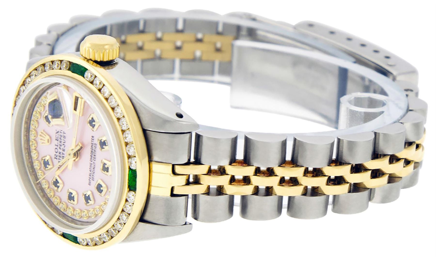 One Ladies 14K Two Tone Rolex Datejust Polished, Serviced & Electronically Tested, 14K Yellow Gold & Stainless Steel Case: 26mm, 14K Yellow Gold Crown, Custom Bezel: New 18K Yellow Gold Emerald Channel Set Diamond Bezel, Diamond + Gem Count: 36 Diamonds + 4 Emeralds, Total Weight 1.00 Carat, Clarity: SI-VS, Color: G to H. Custom Crystal: New Synthetic Sapphire Cyclops Lens. Custom Hands: New Luminescent Hands. Movement: Automatic Winding Movement Caliber 2030. Custom Dial: Pink Mother Of Pearl with Sapphire Diamond Hour Markers, Stone Count: 10 Sapphires + 33 Diamonds In Dial. Date Window: 3 O'clock Position Date Display, Model: Datejust, Condition: G-6 Extra Fine. Bracelet: Two Tone 14K Yellow Gold & Stainless Steel Jubilee. Bright Polish. 6.0 Inch Length, Adjustable. Standard Clasp, With Rolex Logo. This Watch Has Been Serviced Time Tested And Is In Excellent Condition It Is Free Of All Scratches And Dents.