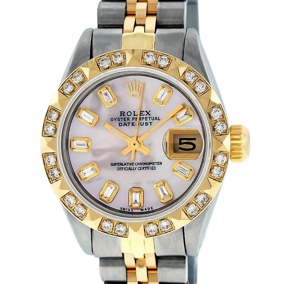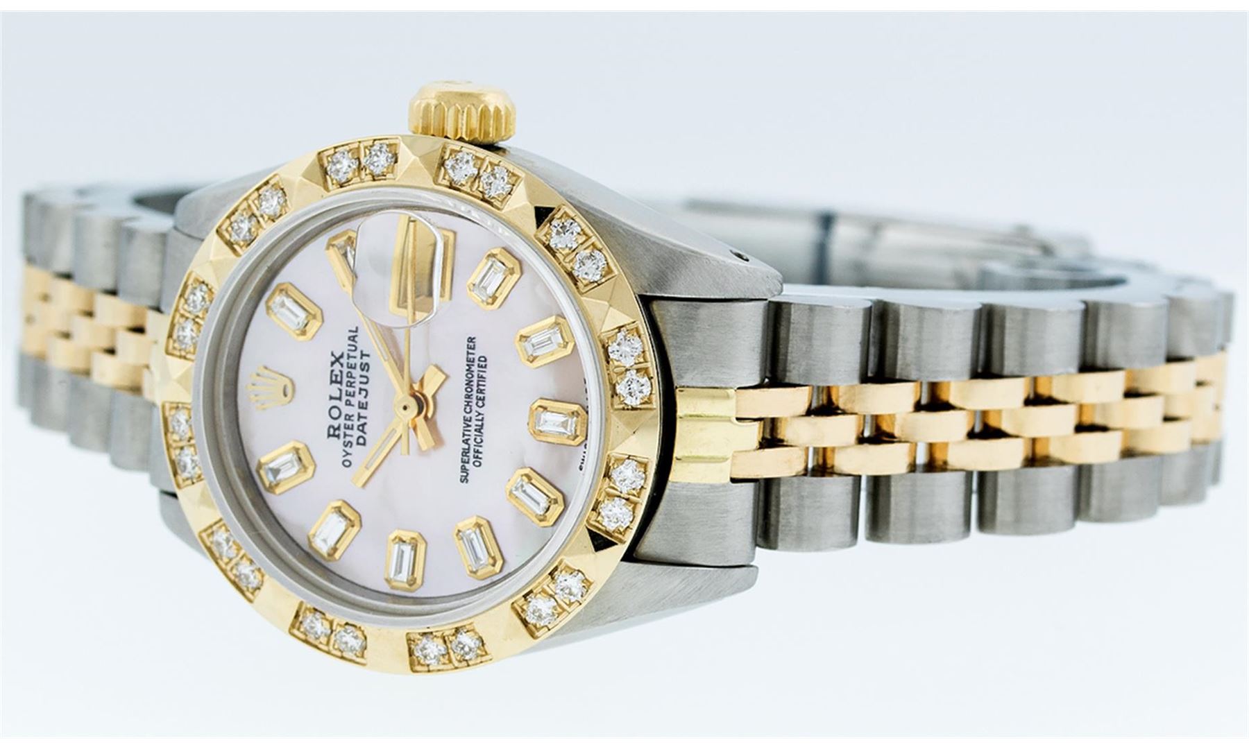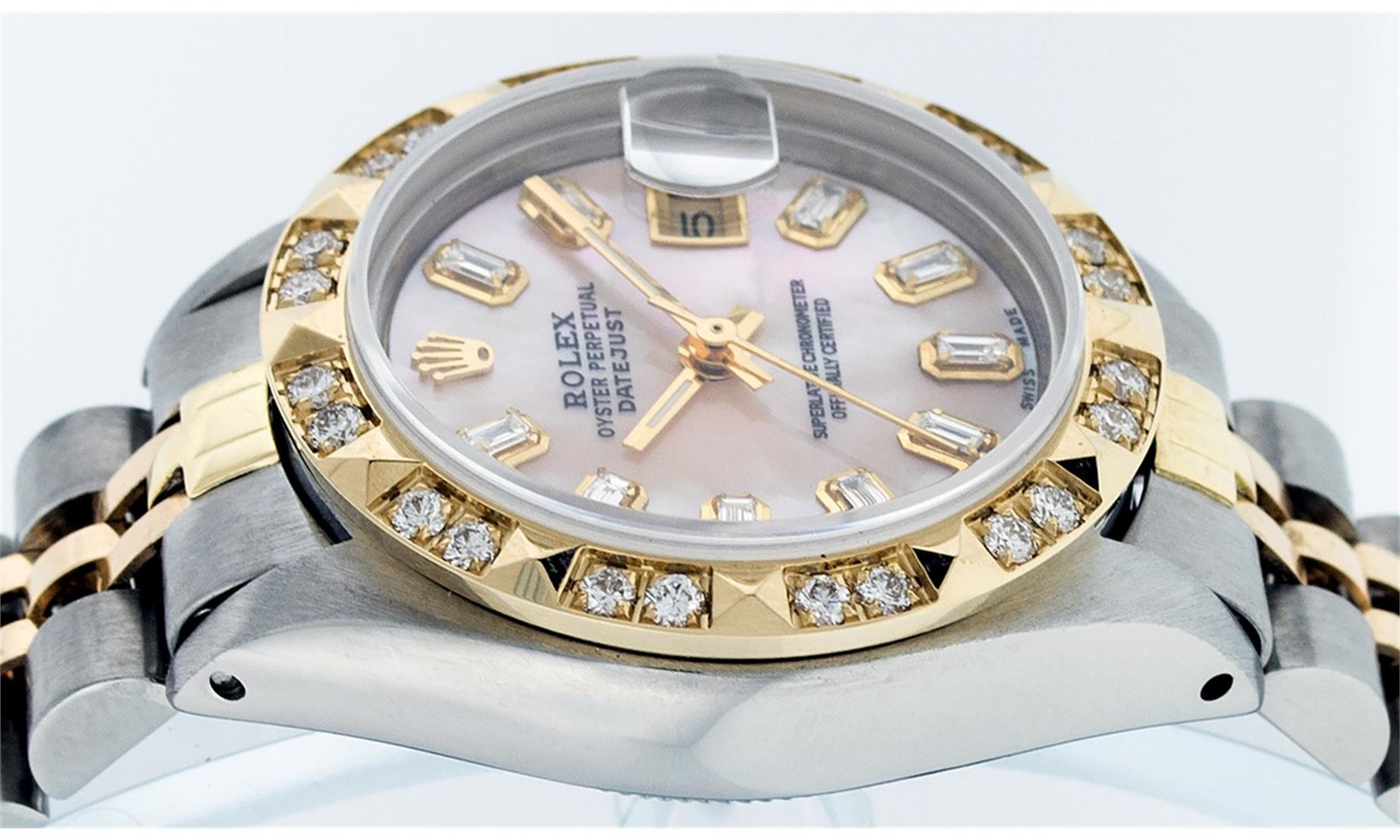 One Ladies 14 Two Tone Rolex Datejust Polished, Serviced & Electronically Tested, 14K Yellow Gold & Stainless Steel Case: 26mm, 14K Yellow Gold Crown, Custom Bezel: 18K Yellow Gold Pyramid Diamond Bezel, Diamond Count: 24 Diamonds Total Weight .50 Carat, Clarity: Si-VS, Color: G to H. Custom Crystal: Synthetic Sapphire Cyclops Lens. Custom Hands: New Luminescent Hands. Movement: Automatic Winding Movement Caliber 2030. Custom Dial: Pink Mother Of Pearl Baguette Diamond Hour Markers. 10 Baguette Diamonds In Dial, Clarity: SI-VS, Color: G to H. Date Window: 3 O'Clock Position Date Display, Model: Datejust. Condition: G-6 Extra Fine. Bracelet: Two Tone 14K Yellow Gold & Stainless Steel Jubilee. Bright Polish. 6.0 Inch Length, Adjustable. Standard Clasp, With Rolex Logo. This Watch Has Been Serviced Time Tested And Is In Excellent Condition It Is Free Of All Scratches And Dents.
