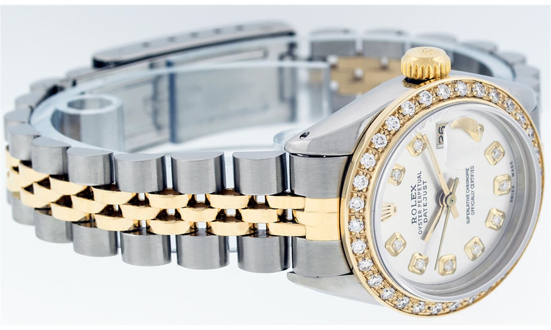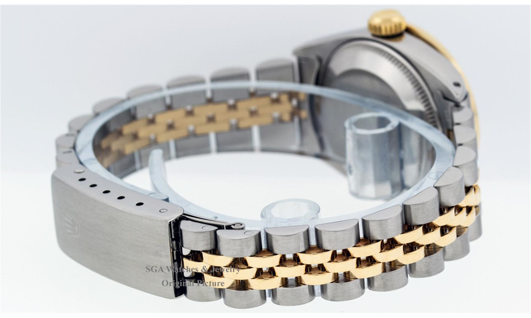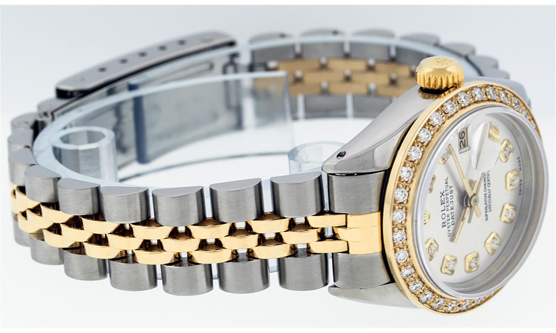 One Ladies 14K Two Tone Rolex Datejust Polished, Serviced & Electronically Tested, 14K Yellow Gold & Stainless Steel Case: 26mm, 14K Yellow Gold Crown, Custom Bezel: 18K Yellow Gold Beadset Diamond Bezel, Diamond Count: 32 Diamonds Total Weight .70 Carat, Clarity: Si-VS, Color: G to H. Custom Crystal: Synthetic Sapphire Cyclops Lens. Custom Hands: New Luminescent Hands. Movement: Automatic Winding Movement Caliber 2030. Custom Dial: Silver Dial Set With Diamond Hour Markers, 10 Diamond in Dial G To H In Color, Si-VS Clarity. Date Window: 3 O'Clock Position Date Display, Model: Datejust. Condition: G-6 Extra Fine. Bracelet: Two Tone 14K Yellow Gold & Stainless Steel Jubilee. Bright Polish. 6.0 Inch Length, Adjustable. Standard Clasp, With Rolex Logo. This Watch Has Been Serviced Time Tested And Is In Excellent Condition It Is Free Of All Scratches And Dents.