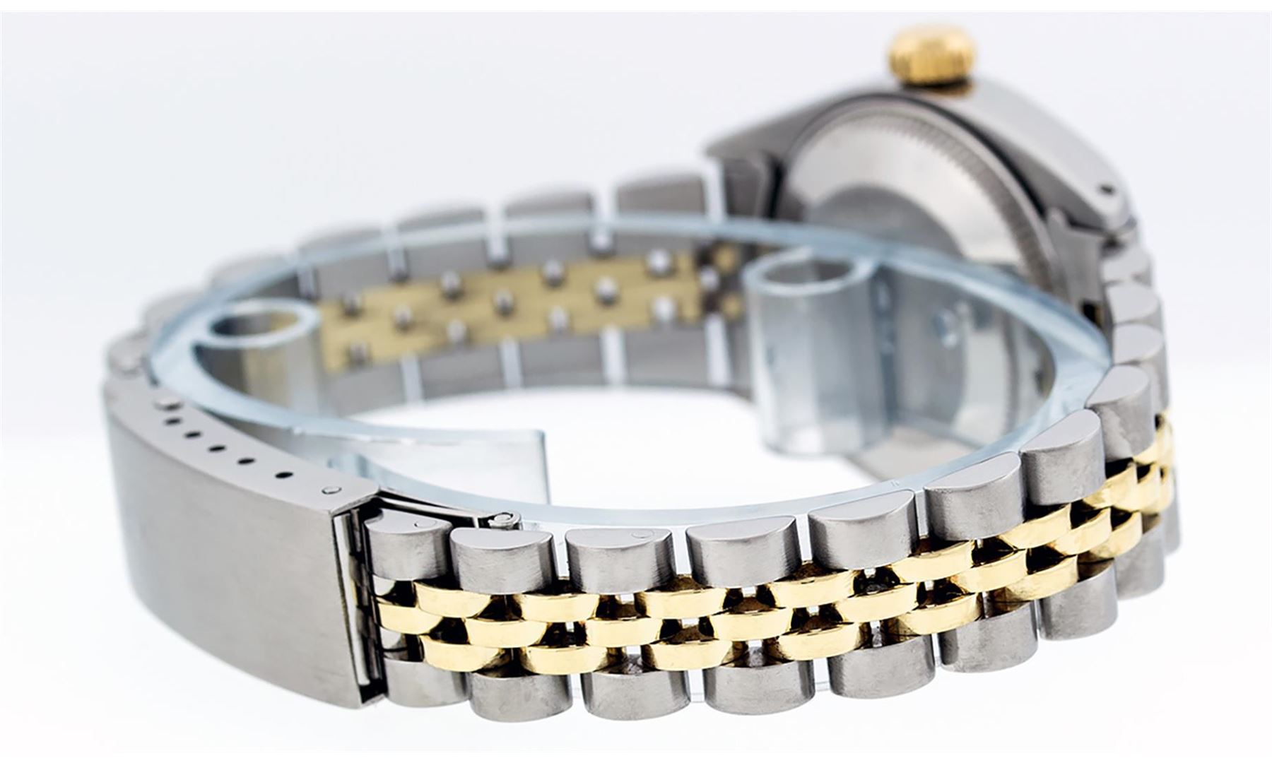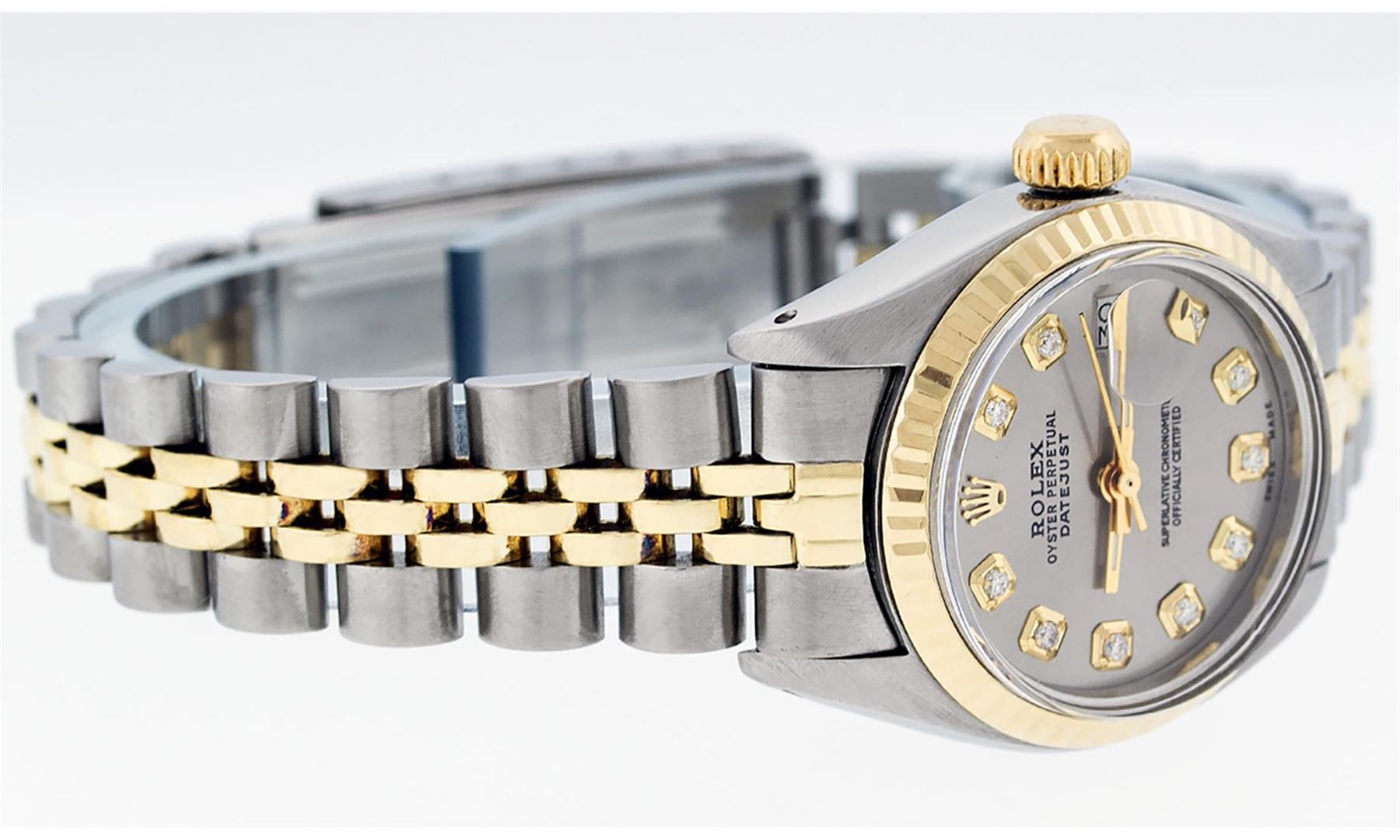 One Ladies 14K Two Tone Rolex Datejust Polished, Serviced & Electronically Tested, 14K Yellow Gold & Stainless Steel Case: 26mm, 14K Yellow Gold Crown, Bezel: 14K Yellow Gold Fluted Bezel. Custom Crystal: New Acrylic Cyclops Lens. Custom Hands: New Luminescent Hands. Movement: Automatic Winding Movement Caliber 2030. Custom Dial: Slate Grey With Diamond Hour Markers, Diamond Count: 10 Diamonds, Color: G to H, Clarity: VS2-SI1. Date Window: 3 O'Clock Position Date Display, Model: Datejust. Condition: G-6 Extra Fine. Bracelet: Two Tone 14K Yellow Gold & Stainless Steel Jubilee Band. Bright Polish. 6.0 Inch Length, Adjustable. Standard Clasp, With Rolex Logo. This Watch Has Been Serviced Time Tested And Is In Excellent Condition It Is Free Of All Scratches And Dents.
