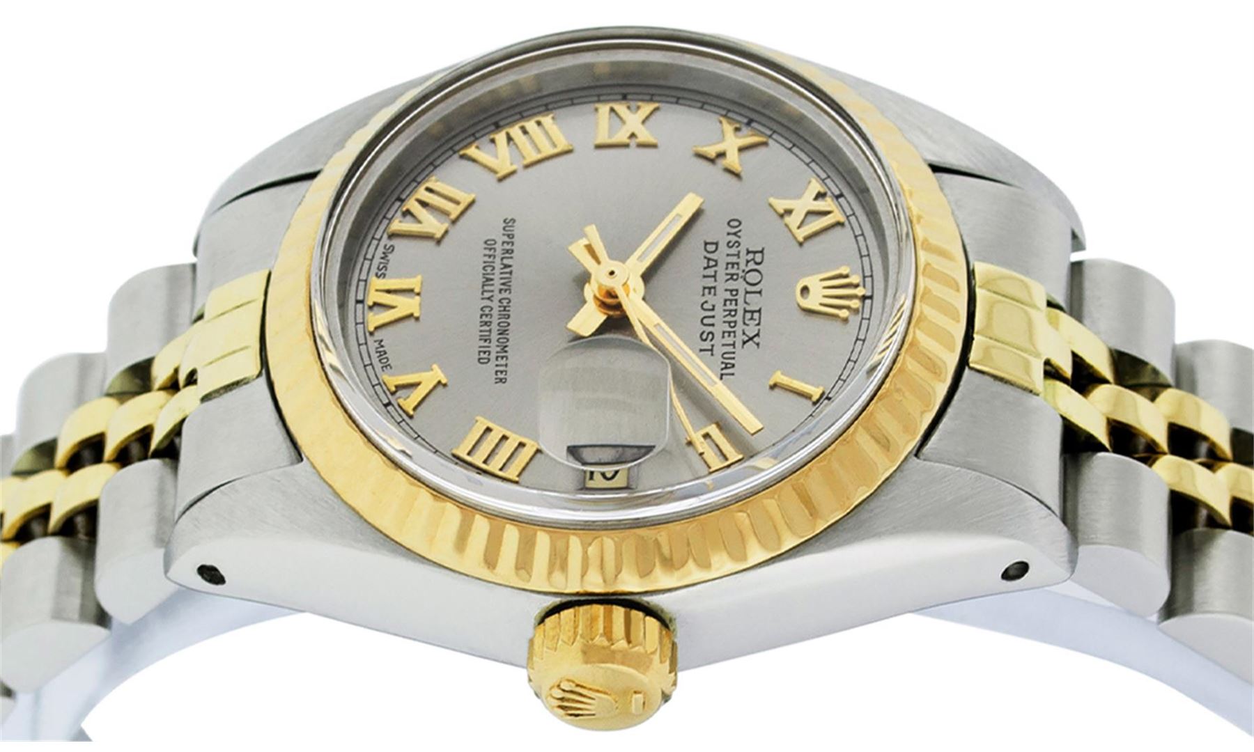 One Ladies 14K Two Tone Rolex Datejust Polished, Serviced & Electronically Tested, 14K Yellow Gold & Stainless Steel, Case Size: 26mm, 14K Yellow Gold Crown, Bezel: 14K Yellow Gold Fluted Bezel. Custom Crystal: New Acrylic Cyclops Lens. Custom Hands: New Luminescent Hands. Movement: Automatic Winding Movement Caliber 2030. Custom Dial: Slate Grey Roman Dial. Date Window: 3 O'Clock Position Date Display, Model: Datejust. Condition: G-6 Extra Fine. Bracelet: Two Tone 14K Yellow Gold & Stainless Steel Jubilee. Bright Polish. 6.0 Inch Length, Adjustable. Standard Clasp, With Rolex Logo. This Watch Has Been Serviced Time Tested And Is In Excellent Condition It Is Free Of All Scratches And Dents.