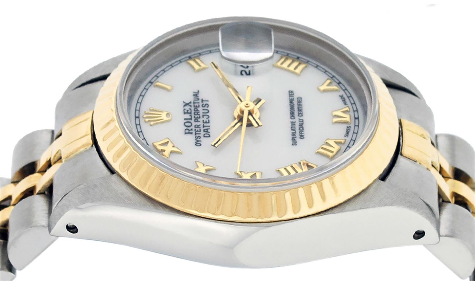 One Ladies 14K Two Tone Rolex Datejust Polished, Serviced & Electronically Tested, 14K Yellow Gold & Stainless Steel, Case Size: 26mm, 14K Yellow Gold Crown, Bezel: 14K Yellow Gold Fluted Bezel. Custom Crystal: New Acrylic Cyclops Lens. Custom Hands: New Luminescent Hands. Movement: Automatic Winding Movement Caliber 2030. Custom Dial: White Roman Dial. Date Window: 3 O'clock Position Date Display, Model: Datejust. Condition: G-6 Extra Fine. Bracelet: Two Tone 14K Yellow Gold & Stainless Steel Jubilee. Bright Polish. 6.0 Inch Length, Adjustable. Standard Clasp, With Rolex Logo. This Watch Has Been Serviced Time Tested And Is In Excellent Condition It Is Free Of All Scratches And Dents.