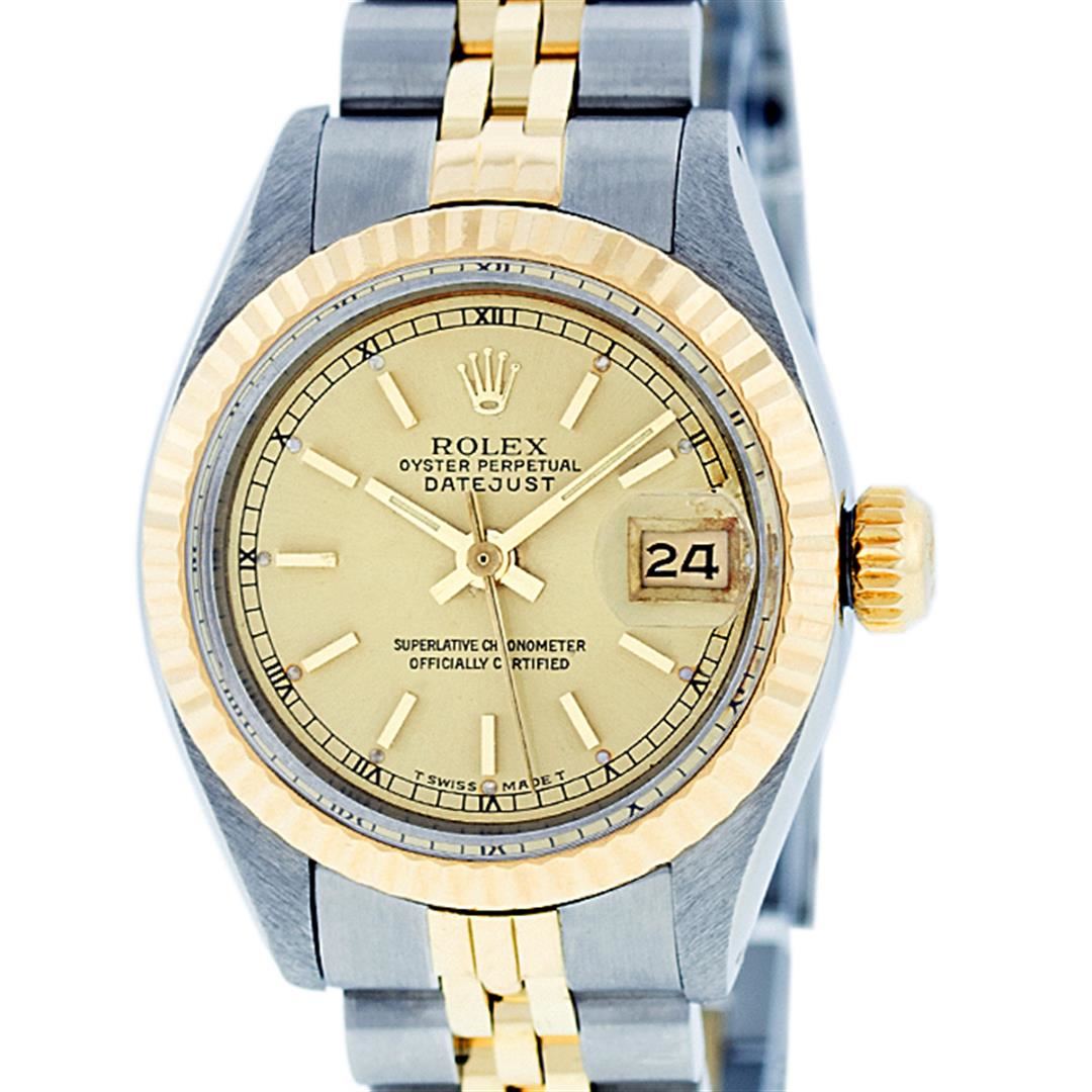 One Ladies 14K Two Tone Rolex Datejust Polished, Serviced & Electronically Tested, 14K Yellow Gold & Stainless Steel Case: 26mm, 14K Yellow Gold Crown, Bezel: 14K Yellow Gold Fluted Bezel. Custom Crystal: New Acrylic Cyclops Lens. Custom Hands: New Luminescent Hands. Movement: Automatic Winding Movement Caliber 2030. Dial: Champagne Index With Roman Track & Lumi Dots. Date Window: 3 O'Clock Position Date Display, Model: Datejust. Condition: G-6 Extra Fine. Bracelet: Two Tone 14K Yellow Gold & Stainless Steel Jubilee Band. Bright Polish. 6.0 Inch Length, Adjustable. Standard Clasp, With Rolex Logo. This Watch Has Been Serviced Time Tested And Is In Excellent Condition It Is Free Of All Scratches And Dents.
