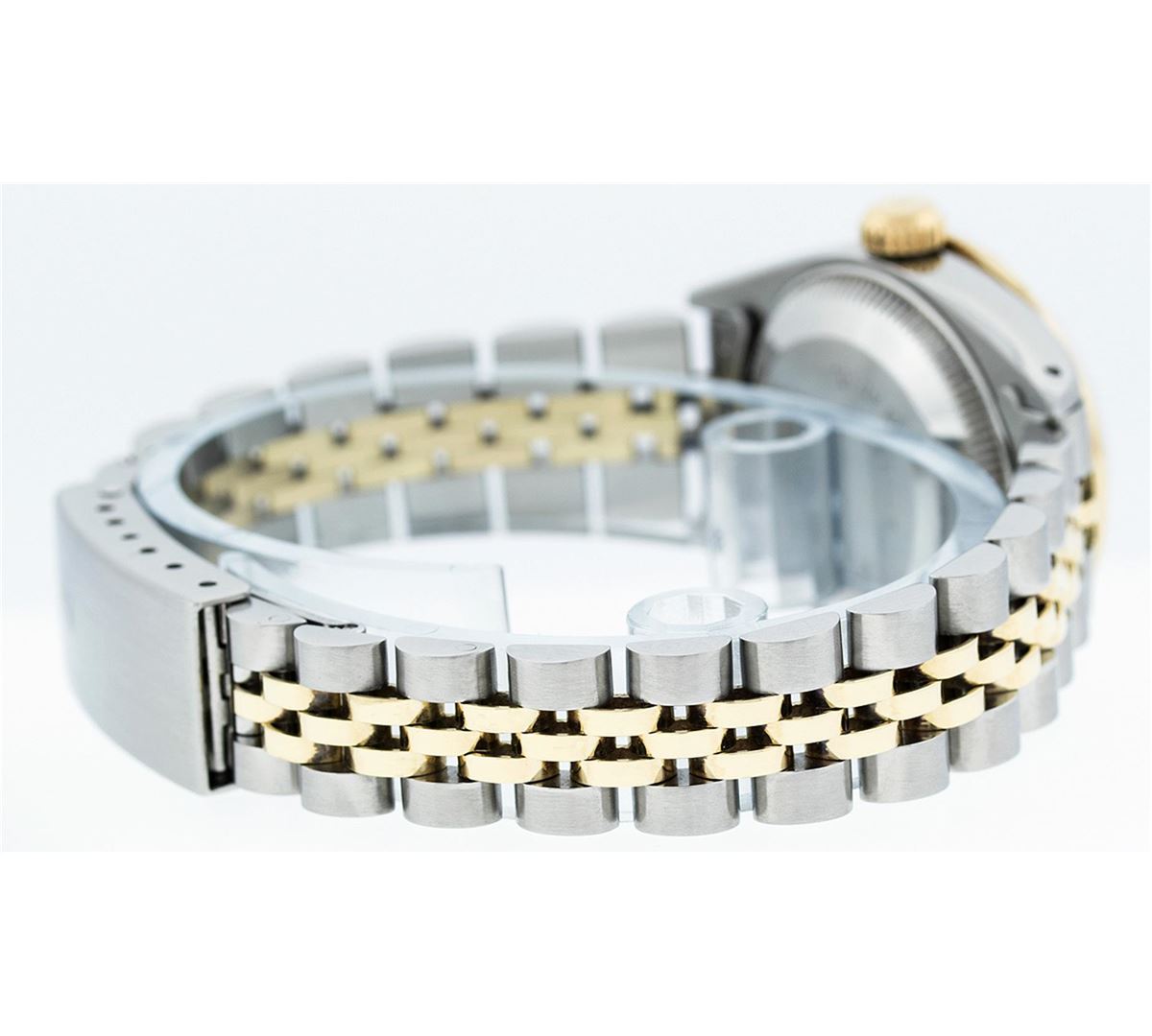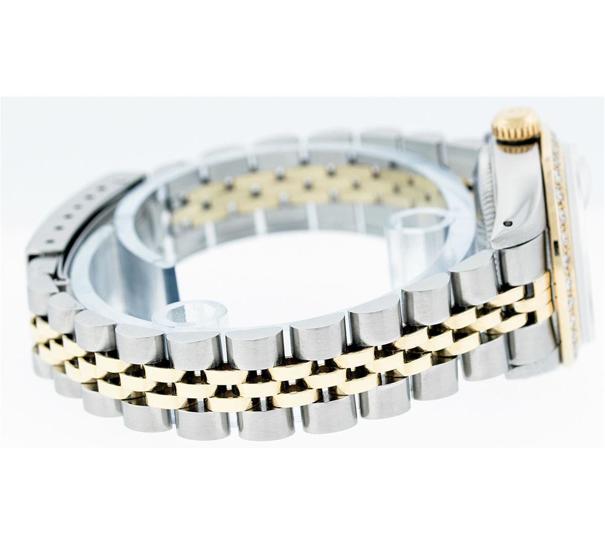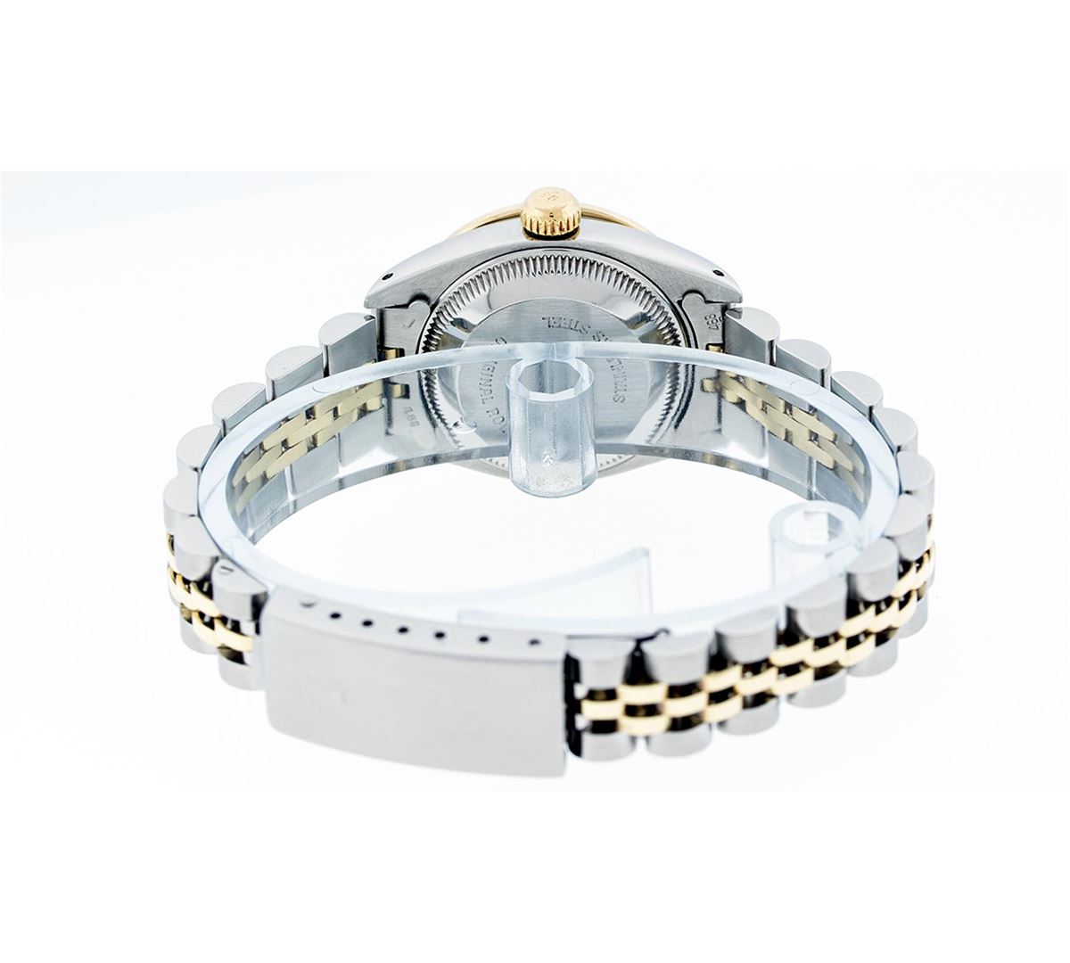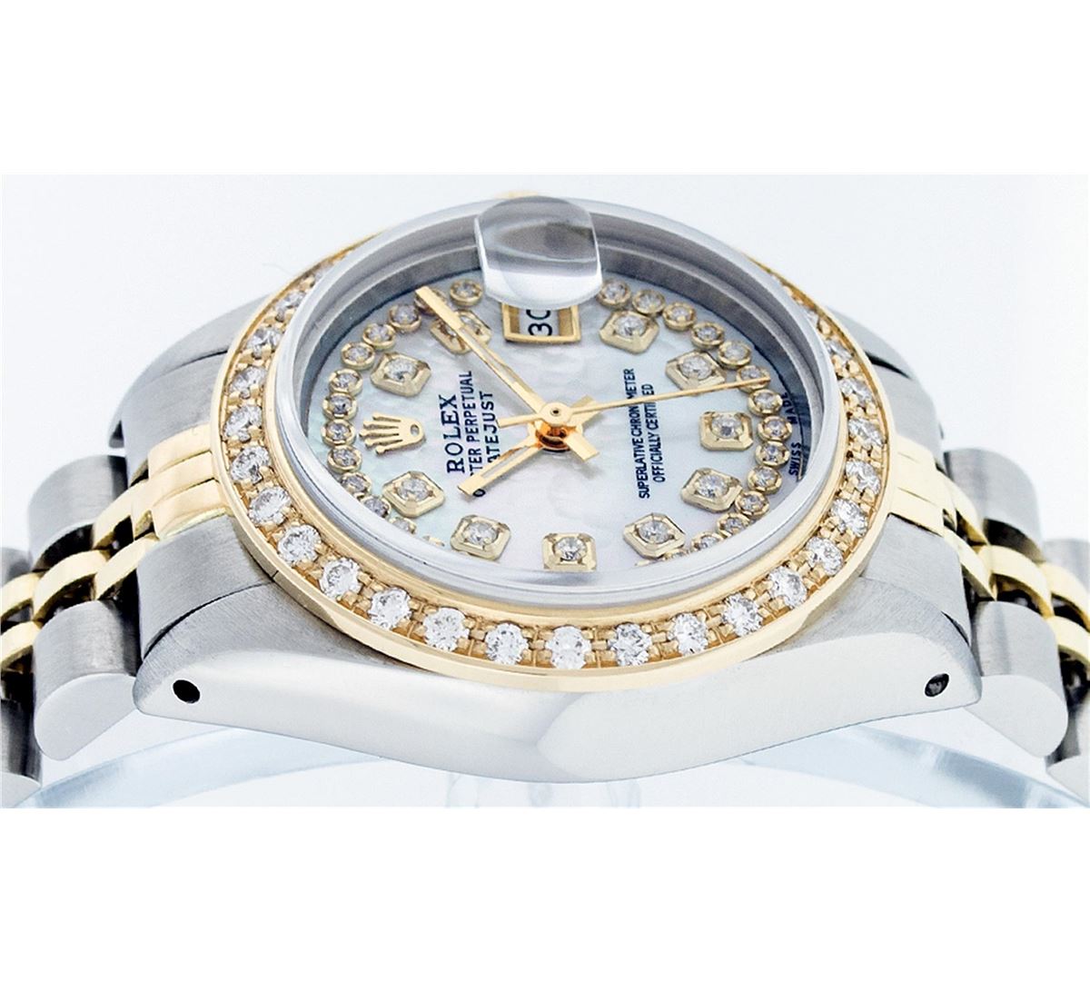 One Ladies Two Tone Rolex Datejust Polished, Serviced & Electronically Tested, 14K Yellow Gold & Stainless Steel Case:26mm, 14K Yellow Gold Crown, Custom Bezel: 18K Yellow Gold Beadset Diamond Bezel, Diamond Count: 32 Diamonds Total Weight .70 Carat, Clarity: Si-VS, Color: G to H. Custom Crystal: Synthetic Sapphire Cyclops Lens. Movement: Automatic Winding Movement Caliber 2030. Custom Dial: Mother Of Pearl String Diamond Dial, Diamond Count: 43 Diamonds, Clarity: SI-VS, Color: G to H. Date Window: 3 O'Clock Position Date Display Model: Datejust. Condition: G-6 Extra Fine. Bracelet: Two Tone 14K Yellow Gold & Stainless Steel Jubilee. Bright Polish. 6.0 Inch Length, Adjustable. Standard Clasp, With Rolex Logo.